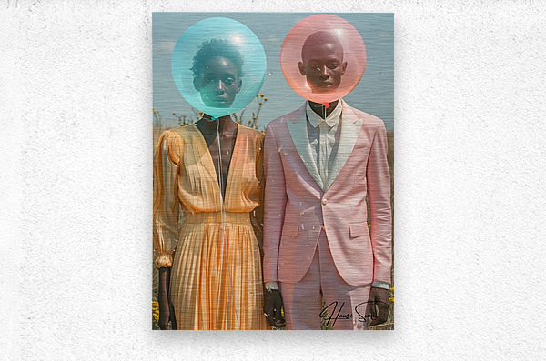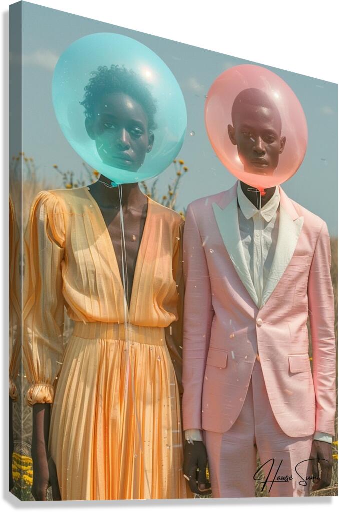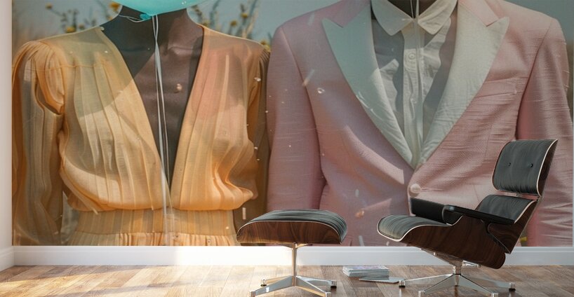 In a serene field, a pair dressed in pastel hues stands with a calm composure. The pastel balloons complement their attire, creating a harmonious blend of colors that evokes a sense of peace and sophisticated simplicity.