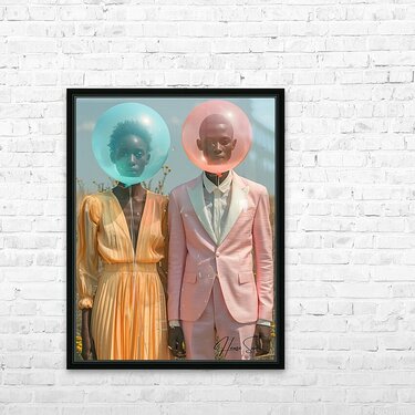 In a serene field, a pair dressed in pastel hues stands with a calm composure. The pastel balloons complement their attire, creating a harmonious blen...[+]