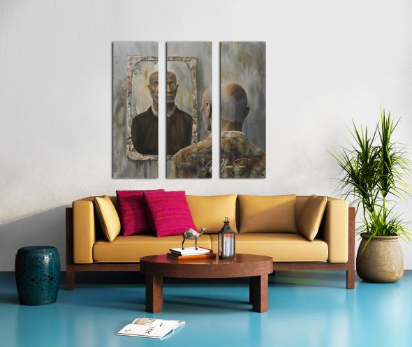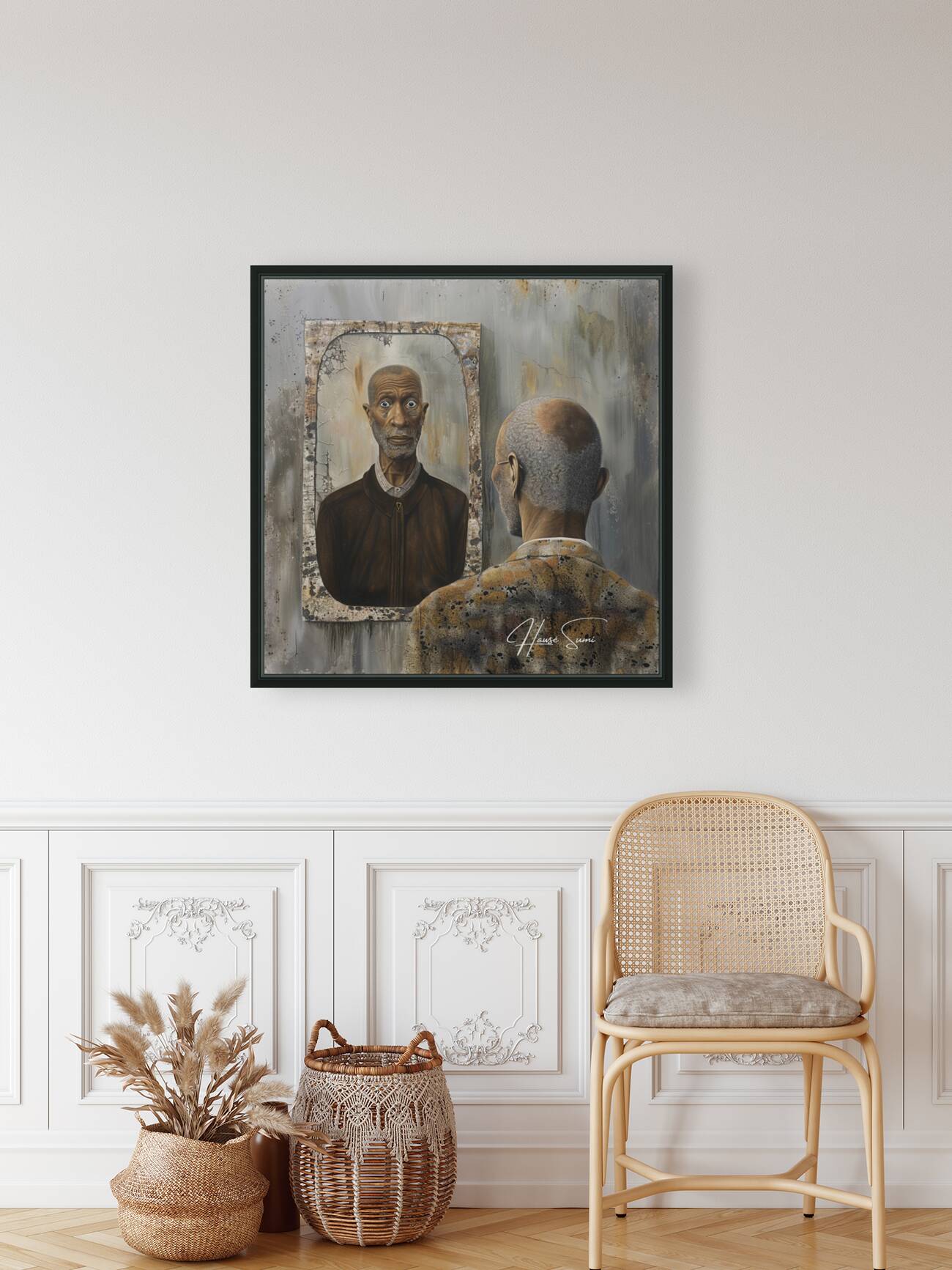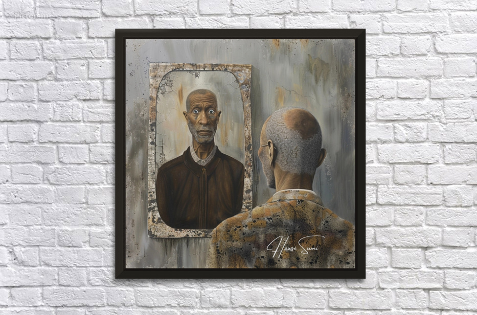 This painting depicts an elderly man gazing into a weathered mirror, seeing a younger version of himself. The cracked and aged mirror symbolizes the passage of time and the inner reflections that reveal the continuum of one's life experiences.