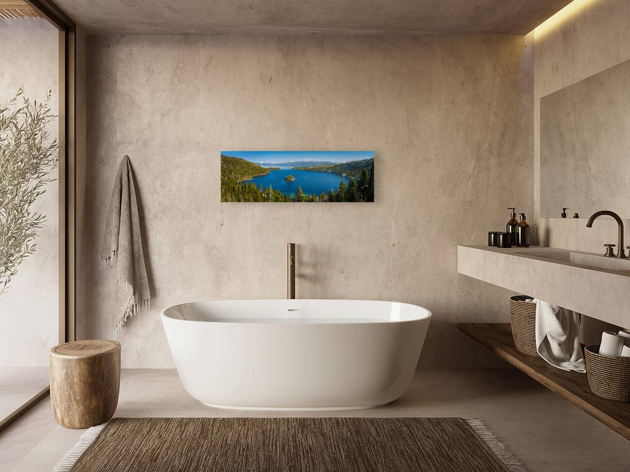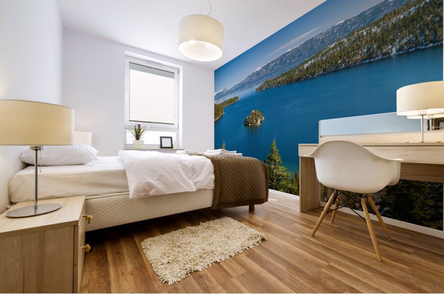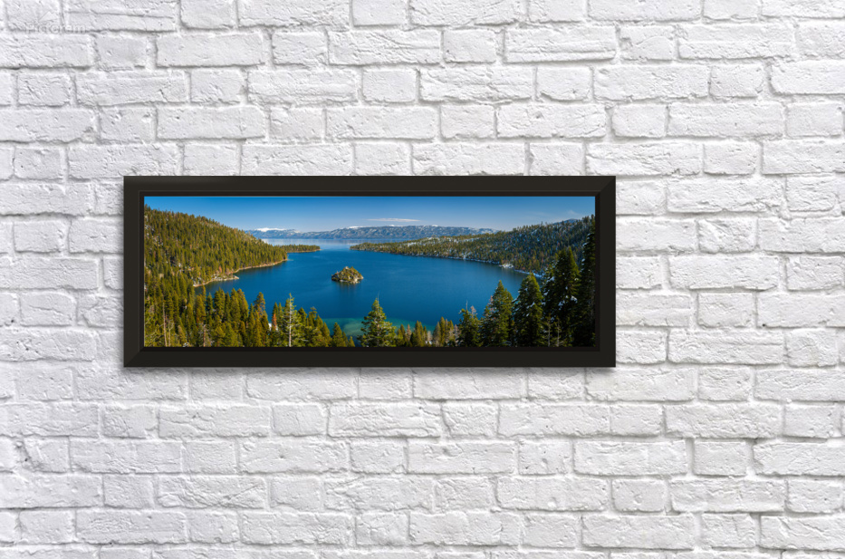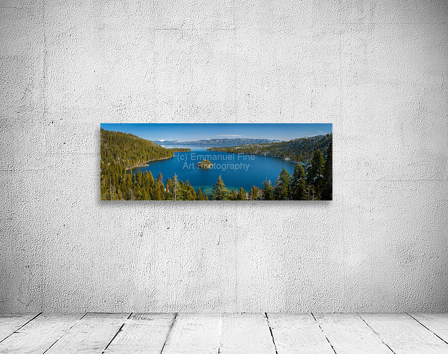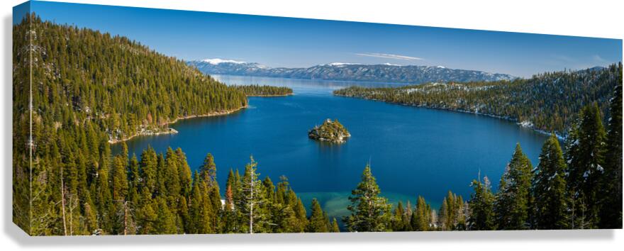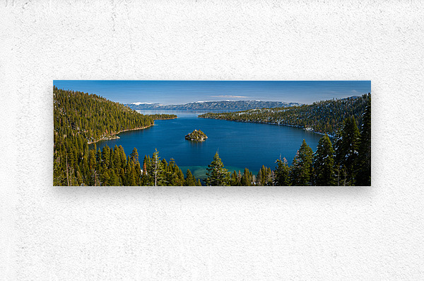 Fannette Island Serene capture of Emerald Bay in Lake Tahoe, with majestic Fannette Island at its heart, showcasing the myriad layers of blue hues tha...[+]