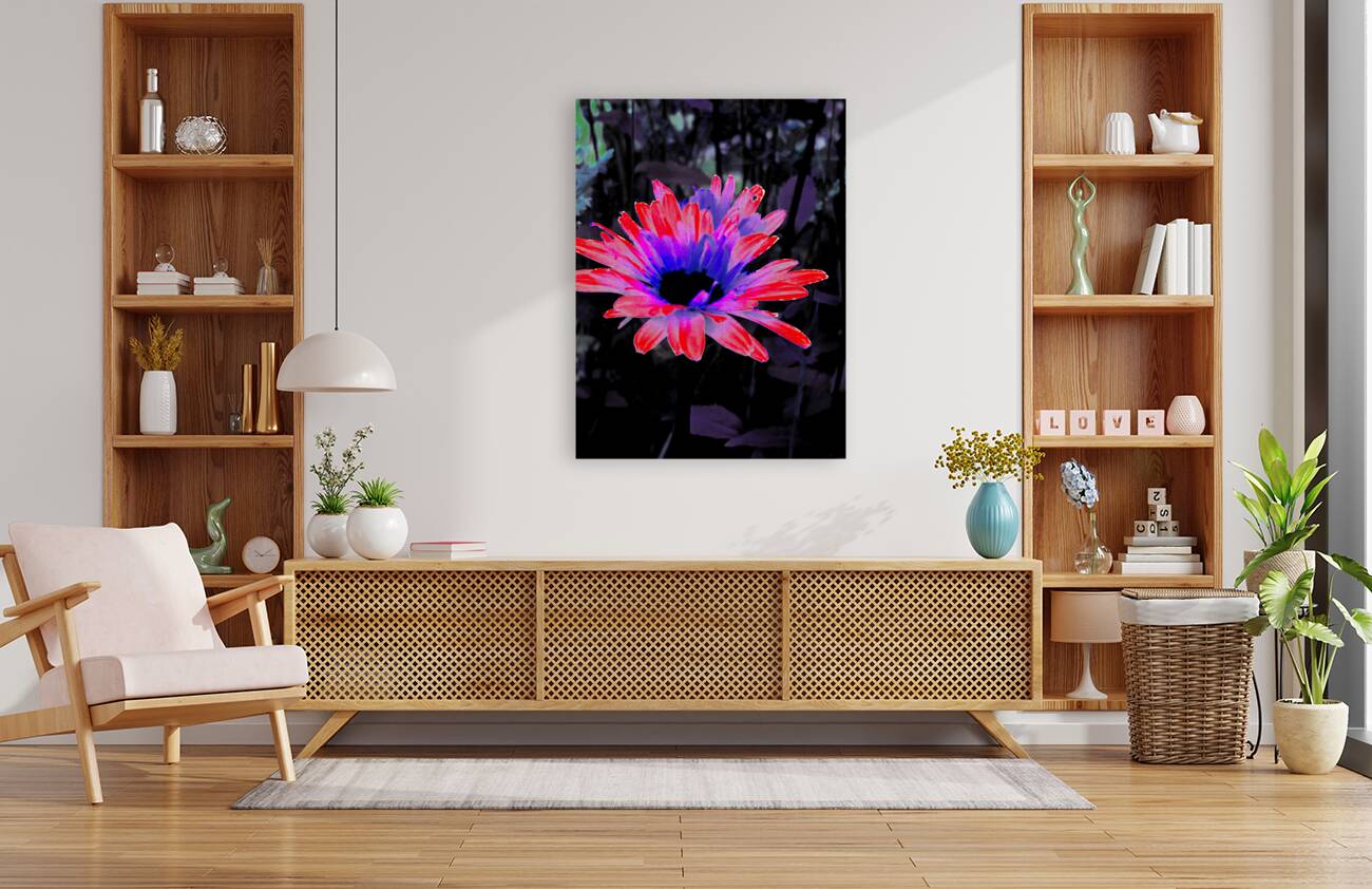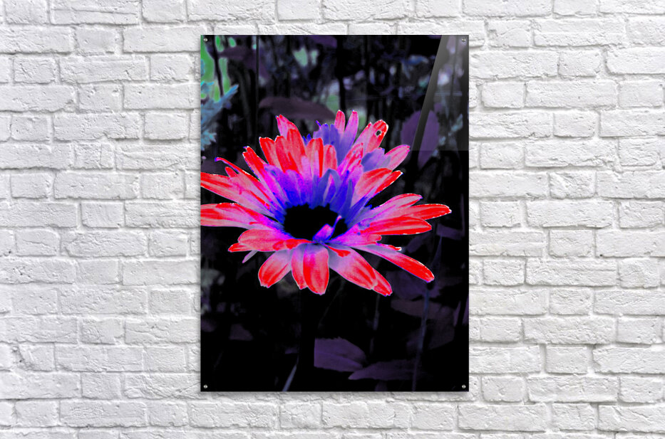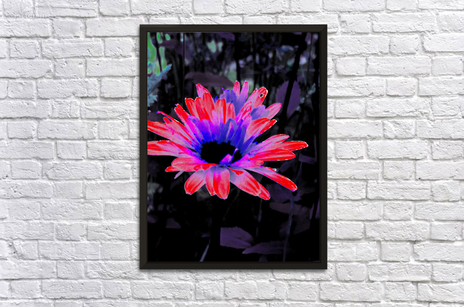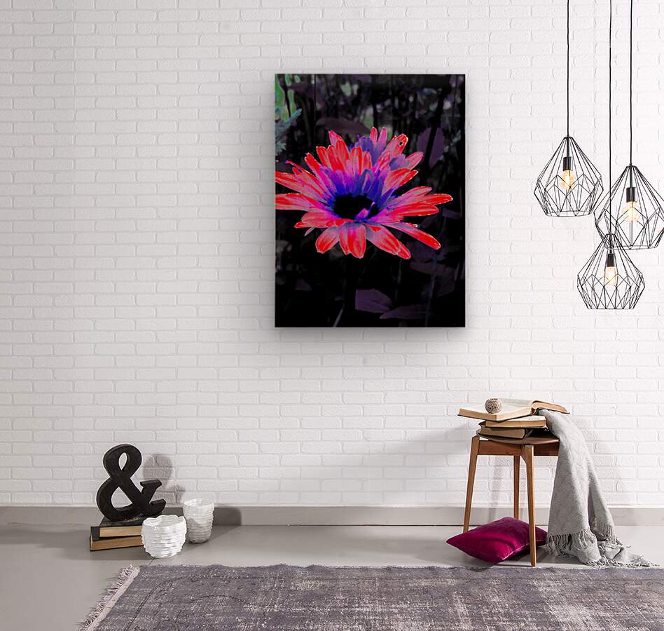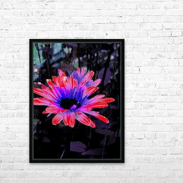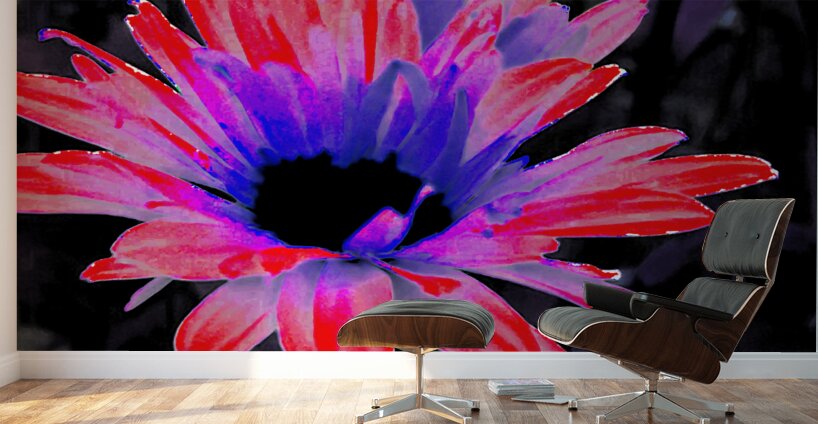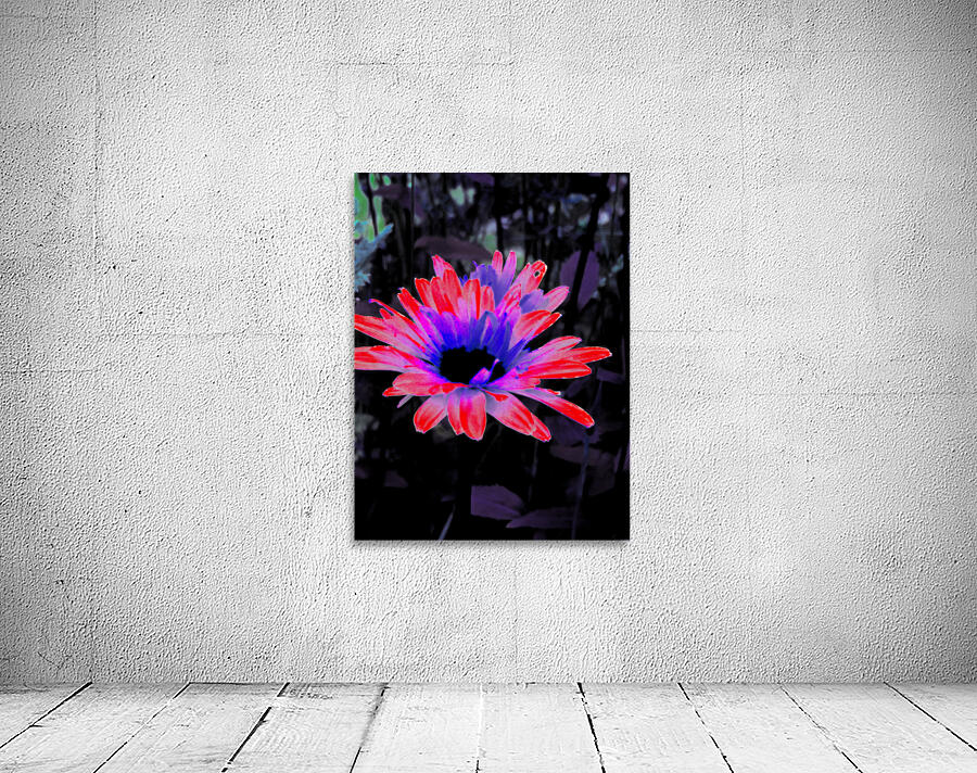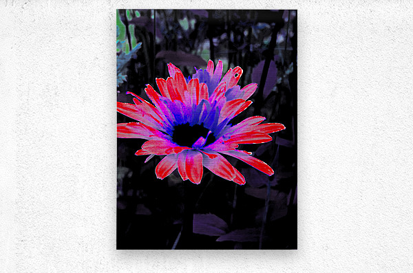 Originally a close up photo of a Daisy flower laterally digitally manipulated into a striking piece of floral contemporary art. A vibrant Daisy stands out against a dark background with its striking red and purple petals. The high contrast and vivid colors create a sense of depth and intensity.