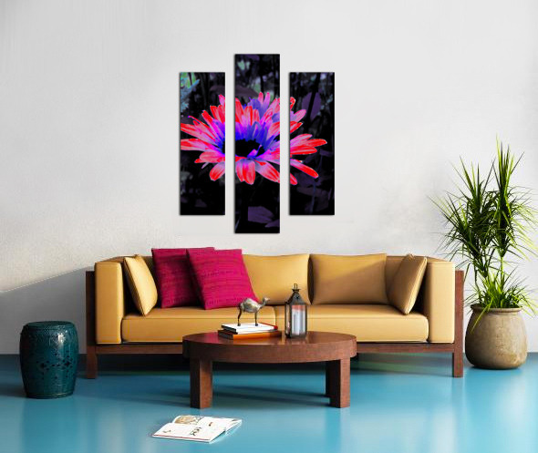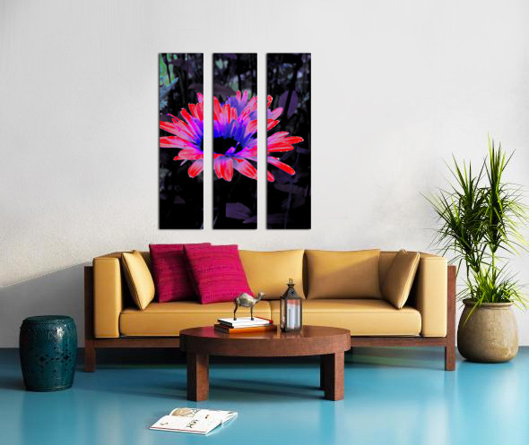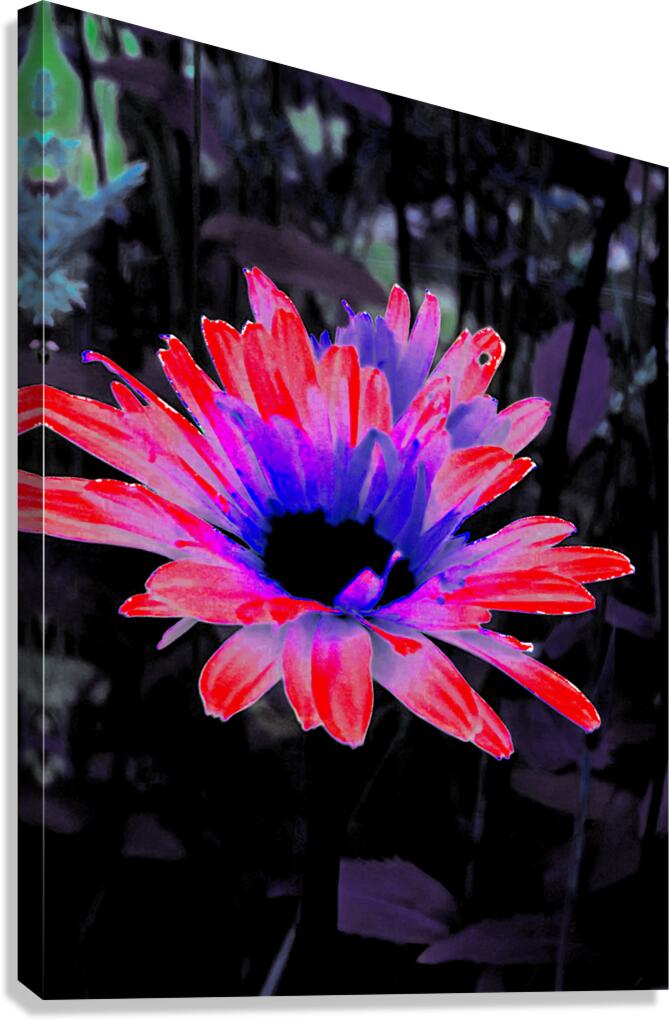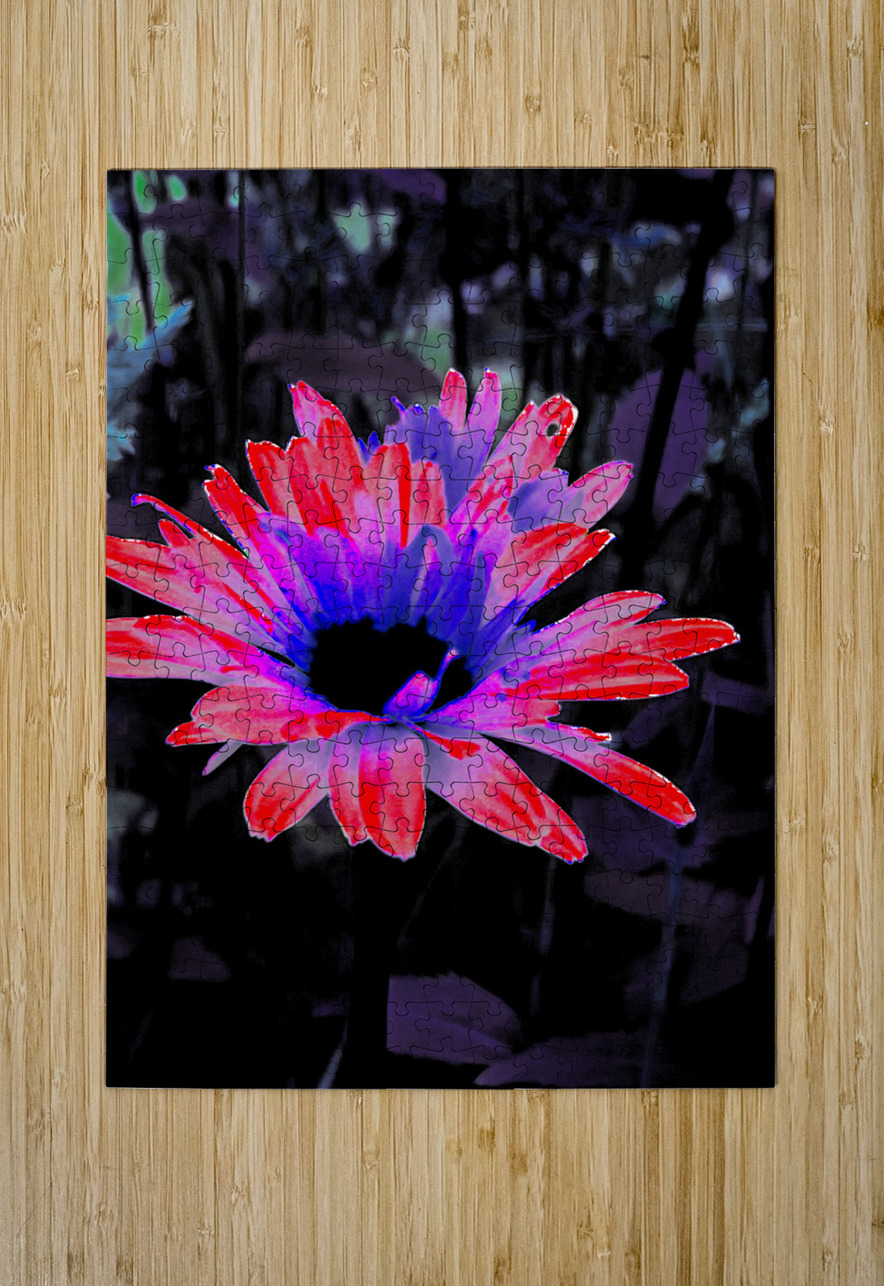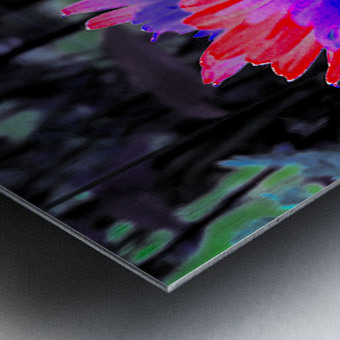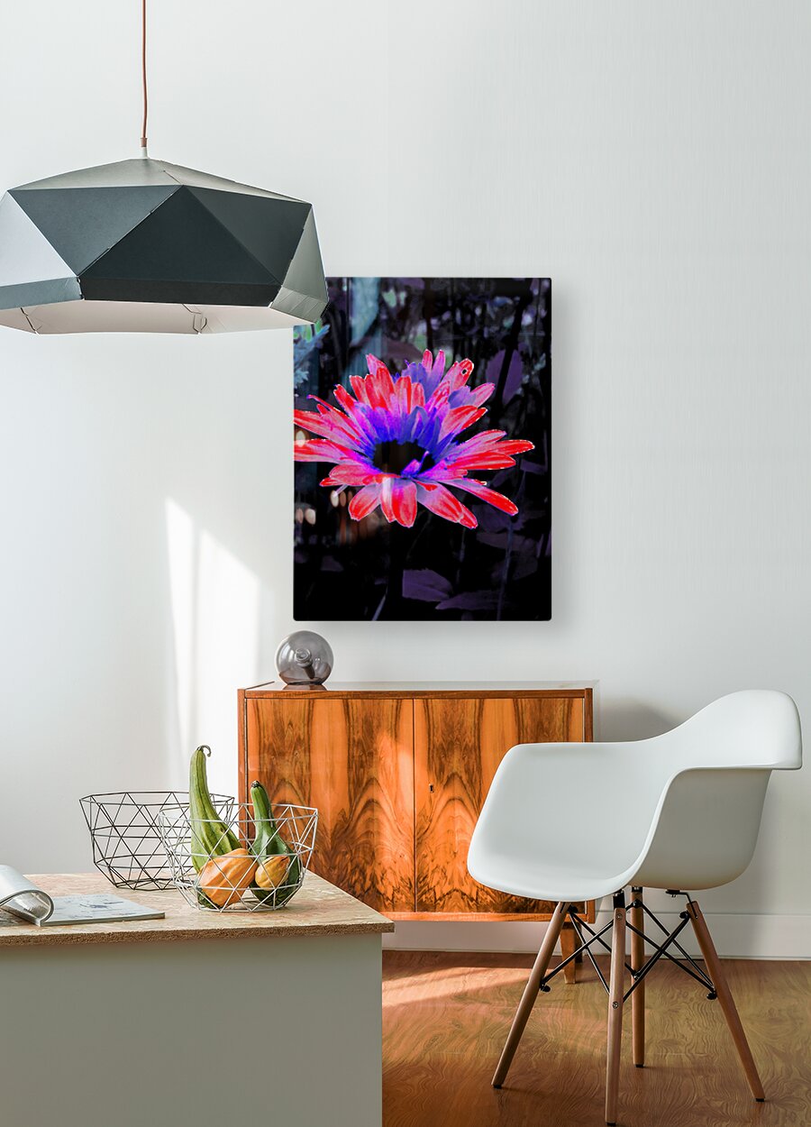 Originally a close up photo of a Daisy flower laterally digitally manipulated into a striking piece of floral contemporary art. A vibrant Daisy stands out against a dark background with its striking red and purple petals. The high contrast and vivid colors create a sense of depth and intensity.