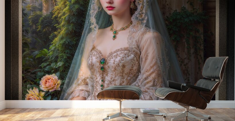 A young woman dressed in an ornate, lace-trimmed gown with a matching veil stands gracefully in a verdant garden by a stone pillar adorned with climbi...[+]