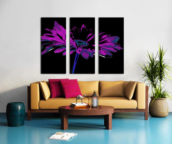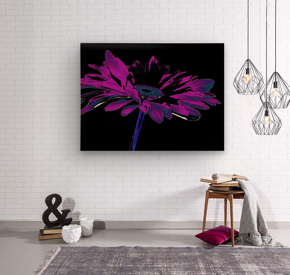 Originally a close up photo of a Daisy flower laterally digitally manipulated into a striking modern floral design. Features a vibrant Daisy flower with rich shades of pink and purple which stands out against a dark background. The bloom appears luminous, creating a striking contrast and highlighting its delicate petals.