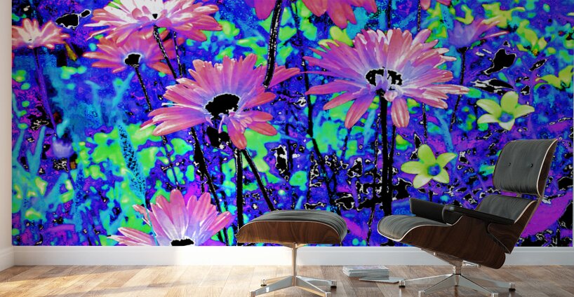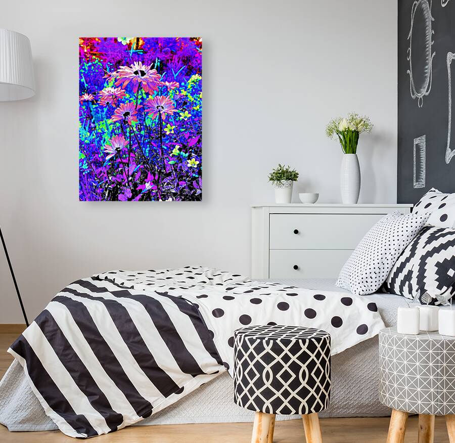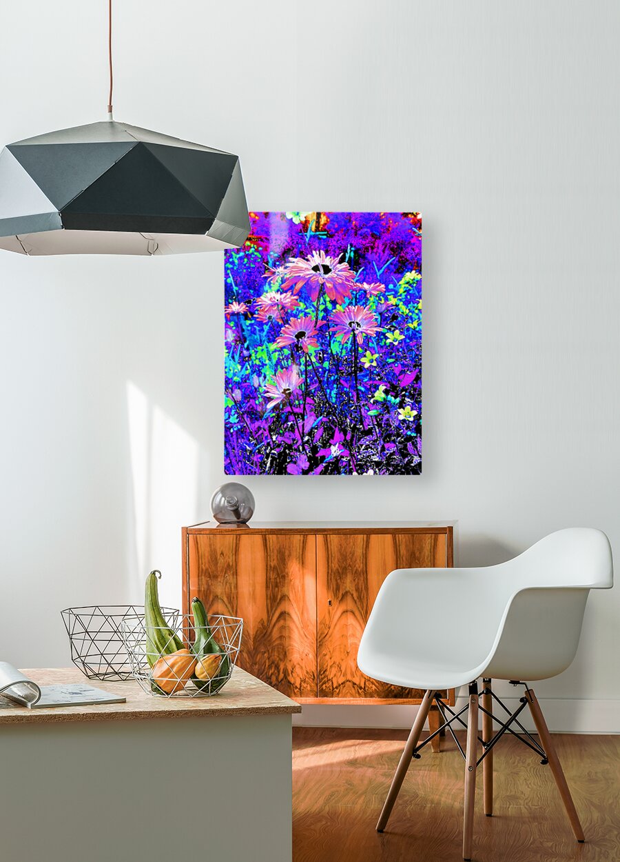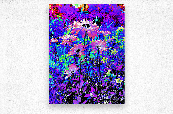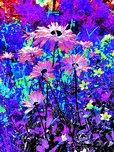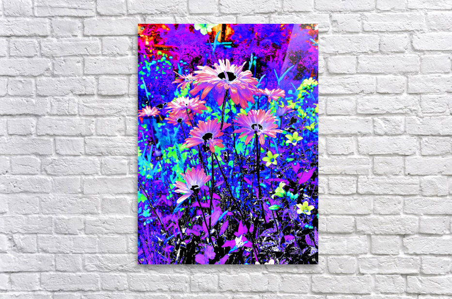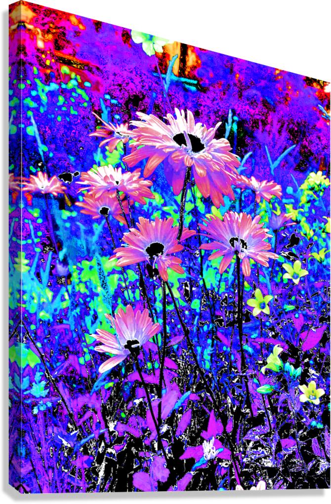 Originally a coloured photo of Daisy flowers laterally digitally manipulated into a stunning piece of modern, contemporary art. Features Daisies and other colourful flowers as they burst with vivid, surreal colours of electric blue, purple, and pink. The vibrant hues create a dreamlike and energetic garden scene.