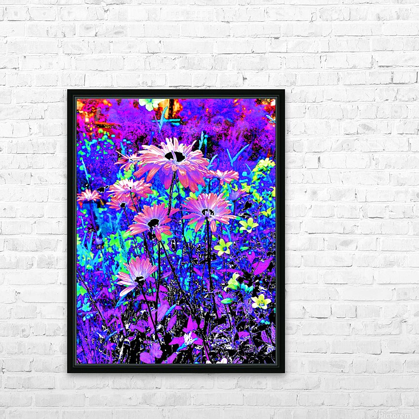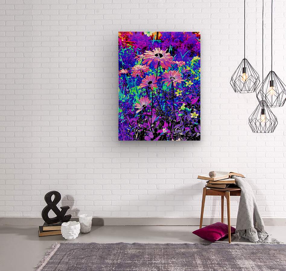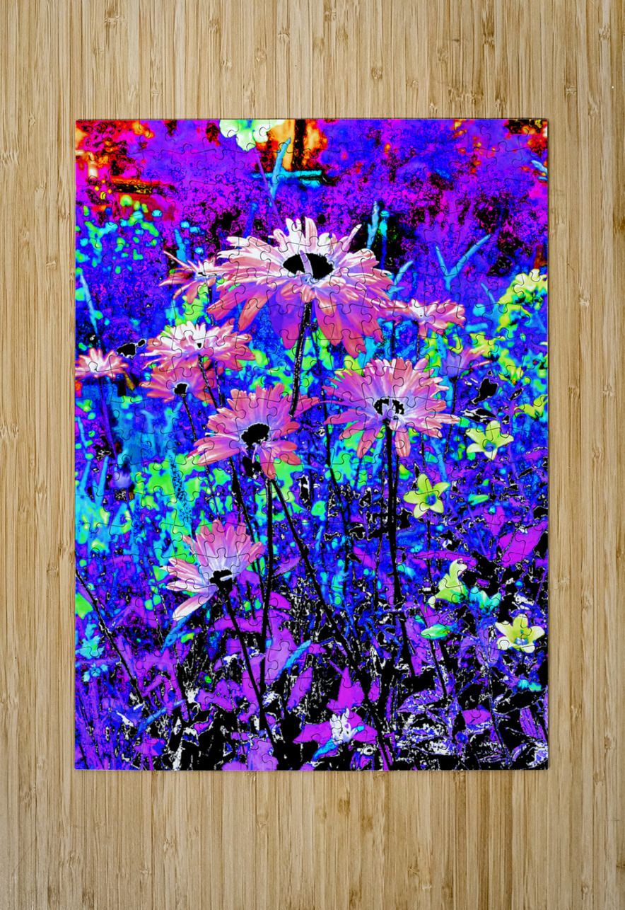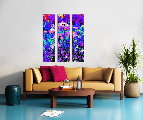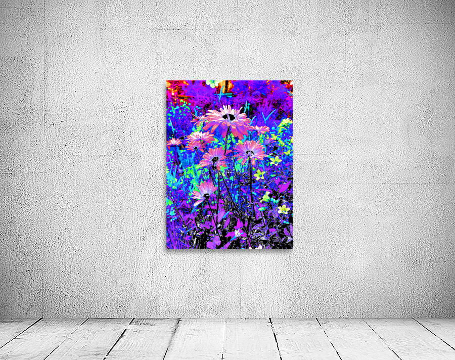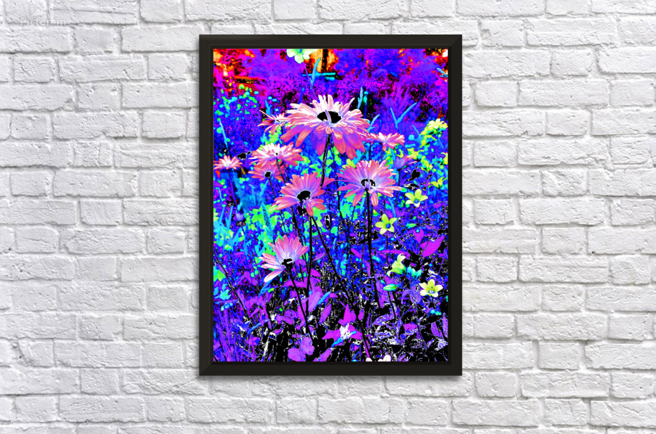 Originally a coloured photo of Daisy flowers laterally digitally manipulated into a stunning piece of modern, contemporary art. Features Daisies and other colourful flowers as they burst with vivid, surreal colours of electric blue, purple, and pink. The vibrant hues create a dreamlike and energetic garden scene.