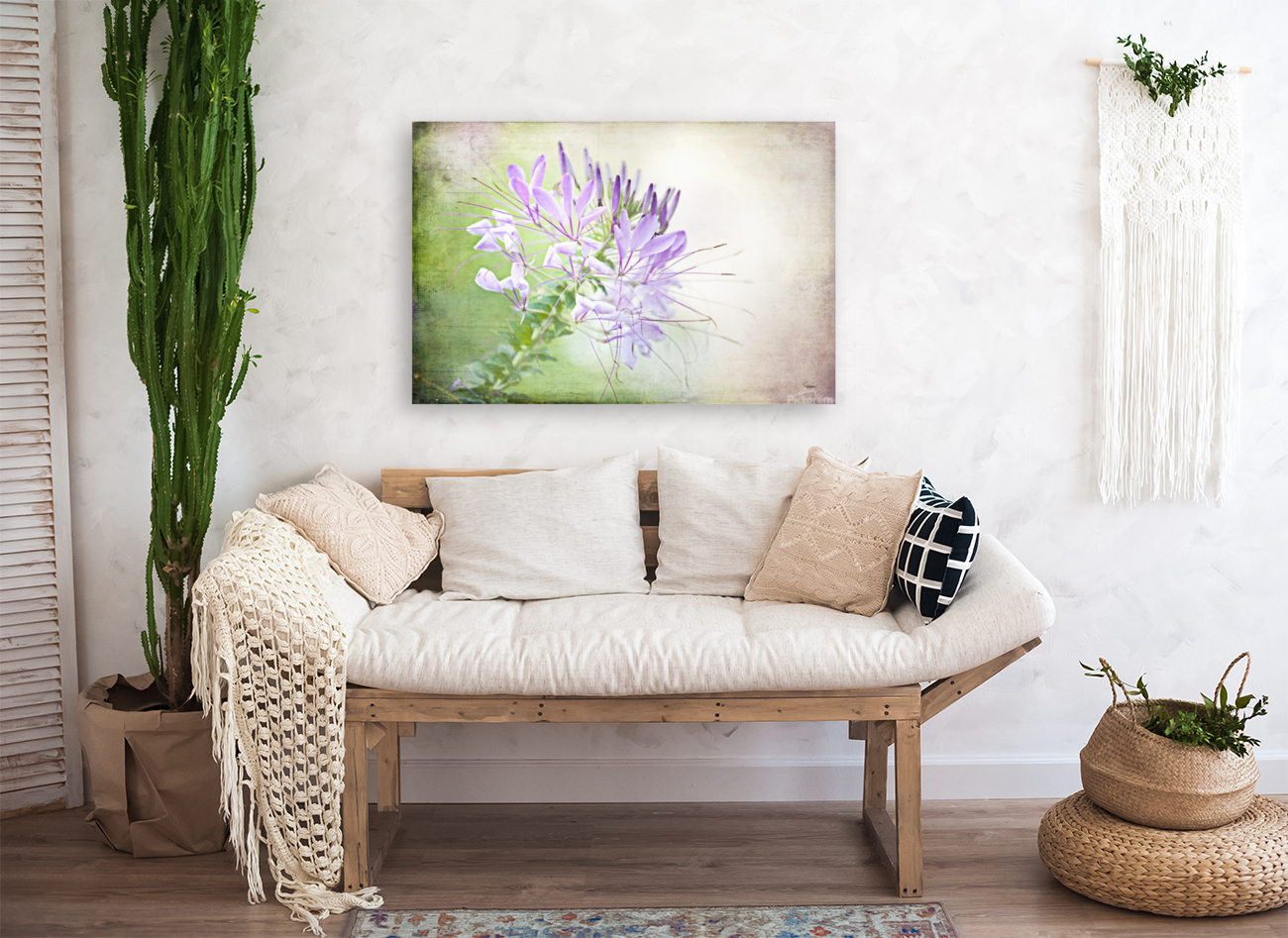 "Veil of Serenity" is a visual poem that captures the ethereal beauty of nature in a serene dance of colors and forms. This delicate portrayal of purple flowers features elongated petals that seem to float on slender stems, adorned with thin, thread-like anthers that give them a wispy and graceful appearance. The palette of soft pastel colors blends seamlessly, invoking a dreamy and tranquil atmosphere that beckons the viewer to pause and immerse in the moment. The composition is masterfully designed to create a sense of calm and serenity, with the background rendered in blurred and muted tones to keep the focus on the intricate details of the flowers. It is as if time stands still, allowing the subtle elegance of each petal and stem to unfold before our eyes. "Veil of Serenity" is a testament to the beauty that can be found when we take a closer, more mindful look at the world around us, encouraging us to find peace and harmony in the smallest wonders of nature.
