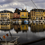 Honfleur, France in Calvados county is a small historic village along the Normandy coastline. It has been an Impressionist painters' dream spot for hundreds of years. Quaint and charming, the old harbor area (Le Vieux Bassin) is a bustle of activity in the evening especially when the weather is great and the outdoor eating spots covered by colorful umbrellas light up the harbour area causing reflections in the waters.
