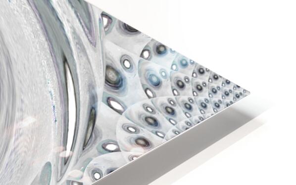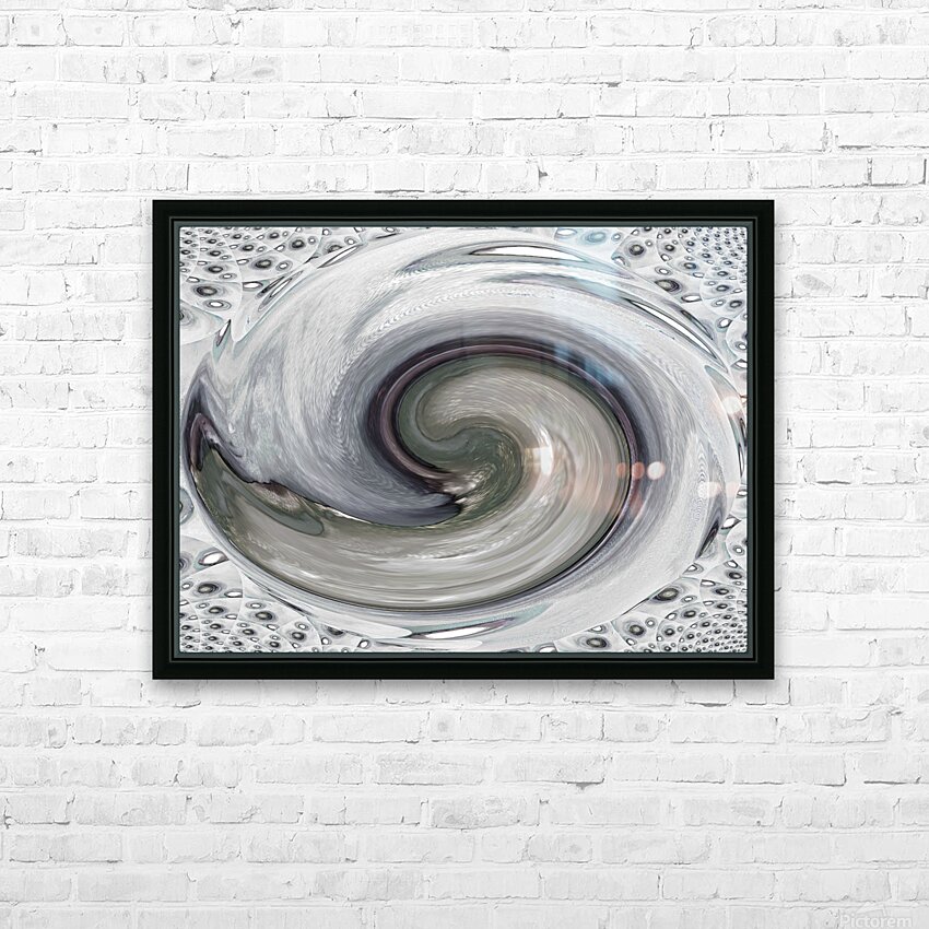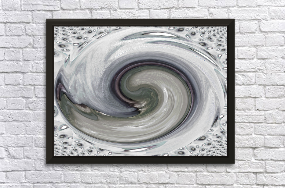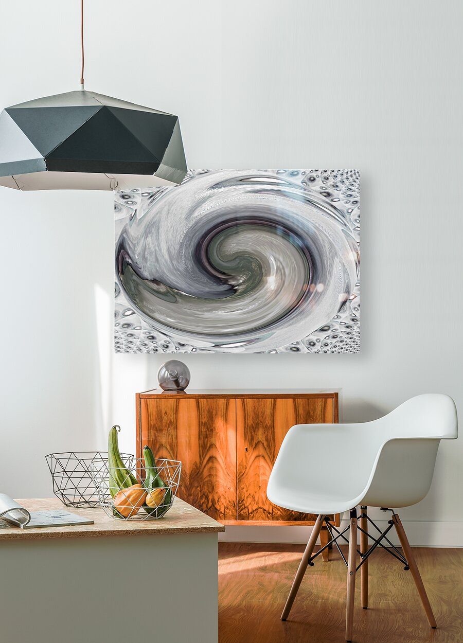 Originally a hand painted acrylic laterally digitally manipulated into a stunning piece of modern, contemporary art. Features a swirling vortex of silver and grey tones which dominates the composition, creating a mesmerizing spiral pattern. The background features a texture resembling an array of metallic orbs, adding depth and complexity to the piece.
