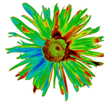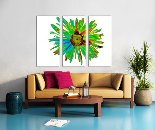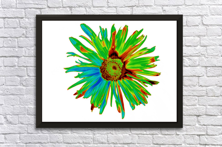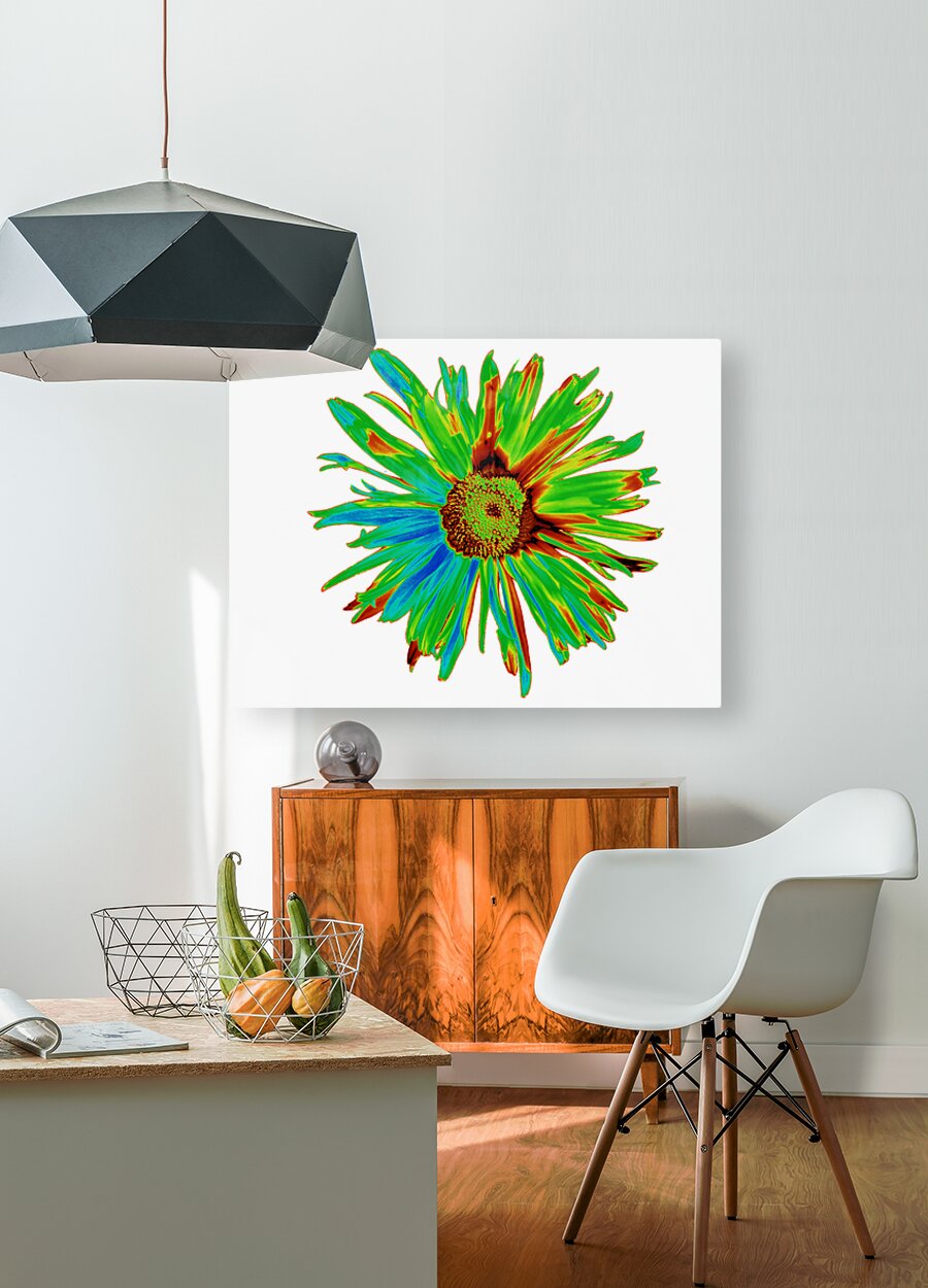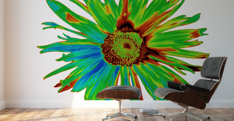 Originally a hand painted acrylic and a close up photo of a Daisy flower laterally combined and digitally manipulated into a striking piece of floral contemporary art. Features a bright, neon-coloured Daisy with vibrant green, blue, and red hues set against a white background. The petals display a dynamic and abstract arrangement, giving a psychedelic and energetic feel.