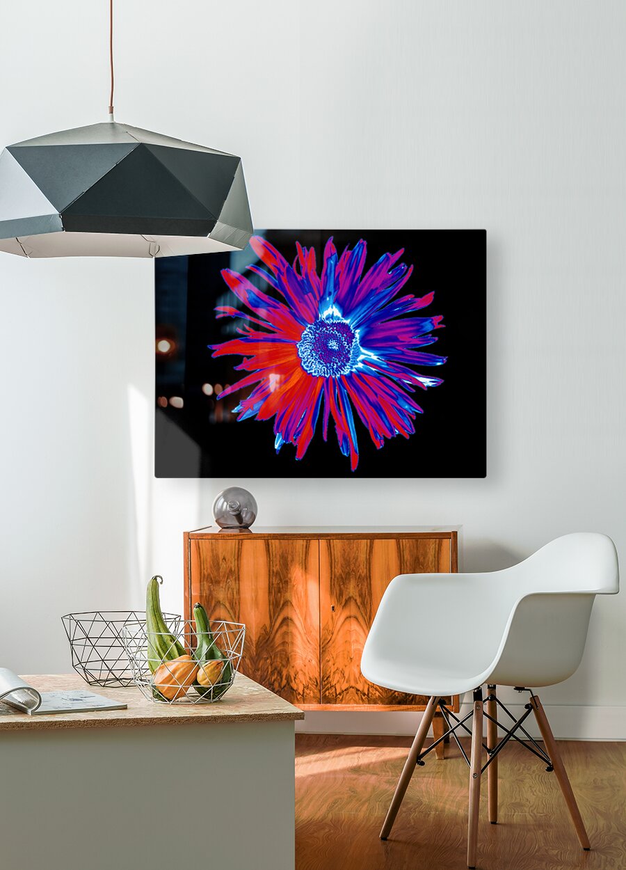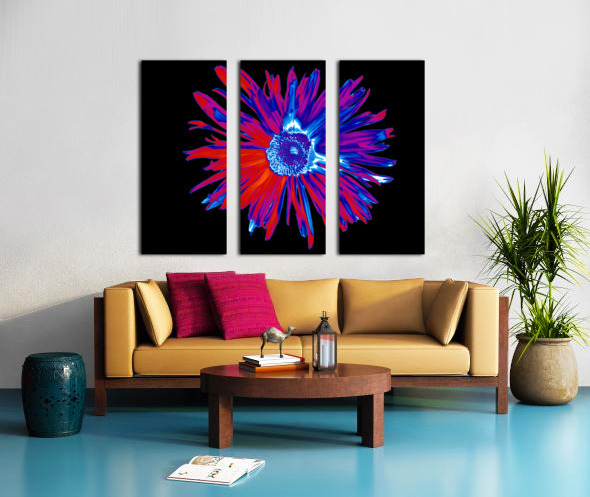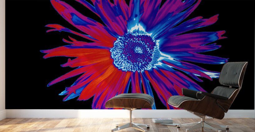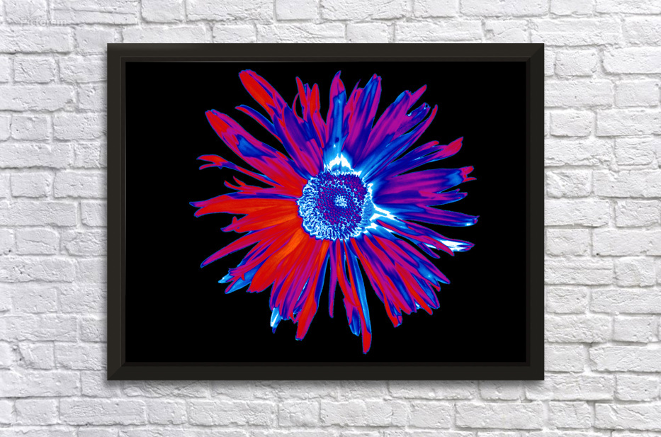 Originally a hand painted acrylic and a close up photo of a Daisy flower laterally combined and digitally manipulated into a stunning piece of contemporary floral art. Features a brightly coloured Daisy with vibrant red and blue petals set against a dark abstract background, with a detailed central disk. The high contrast and vivid tones create a striking visual effect.