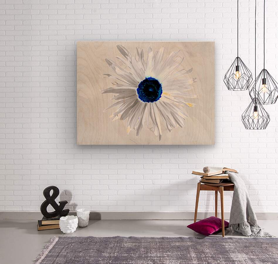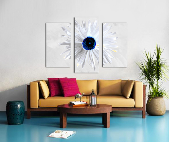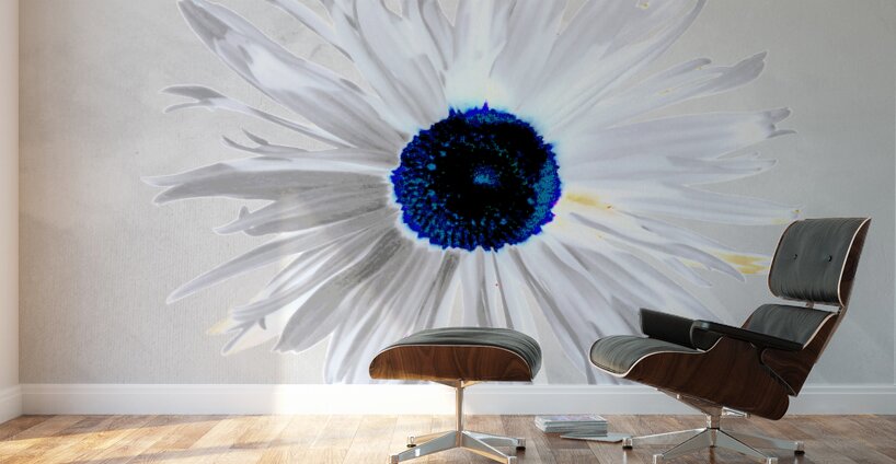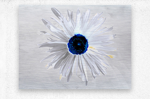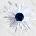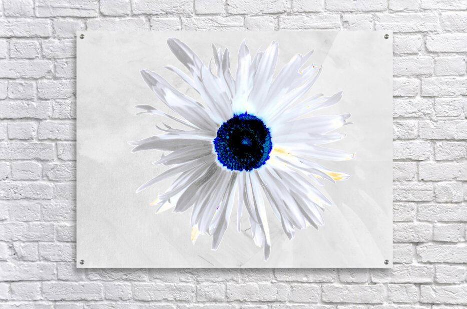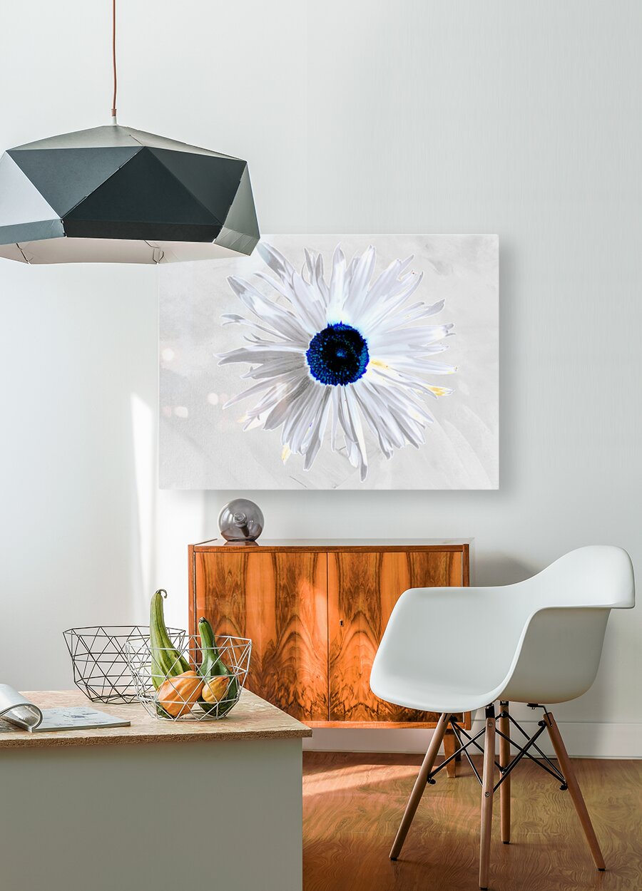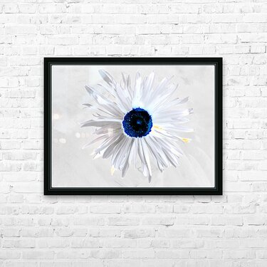 Originally a hand painted acrylic and a close up photo of a Daisy flower laterally combined and digitally manipulated into a stunning piece of contemporary floral art. Features a white Daisy with bold, petals and a striking blue centre set against a light grey background. The high contrast and minimalist colour palette give it a modern and abstract feel.