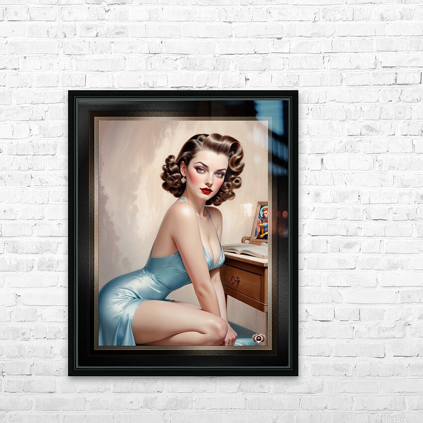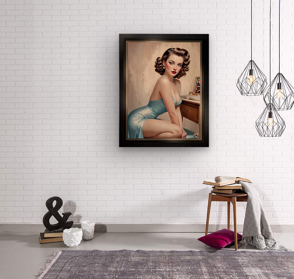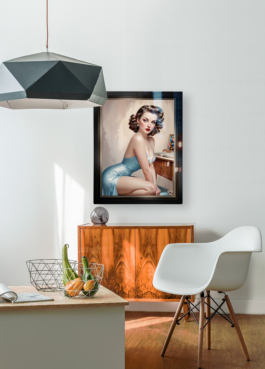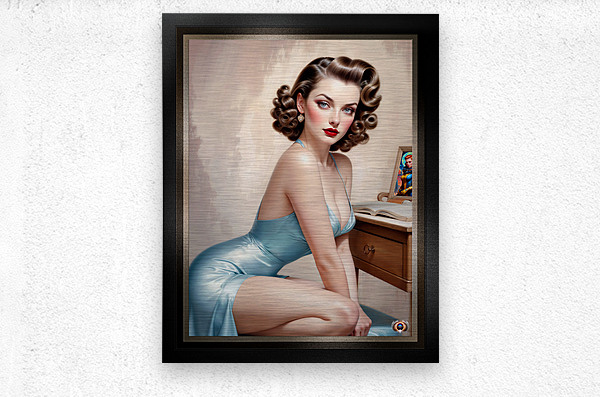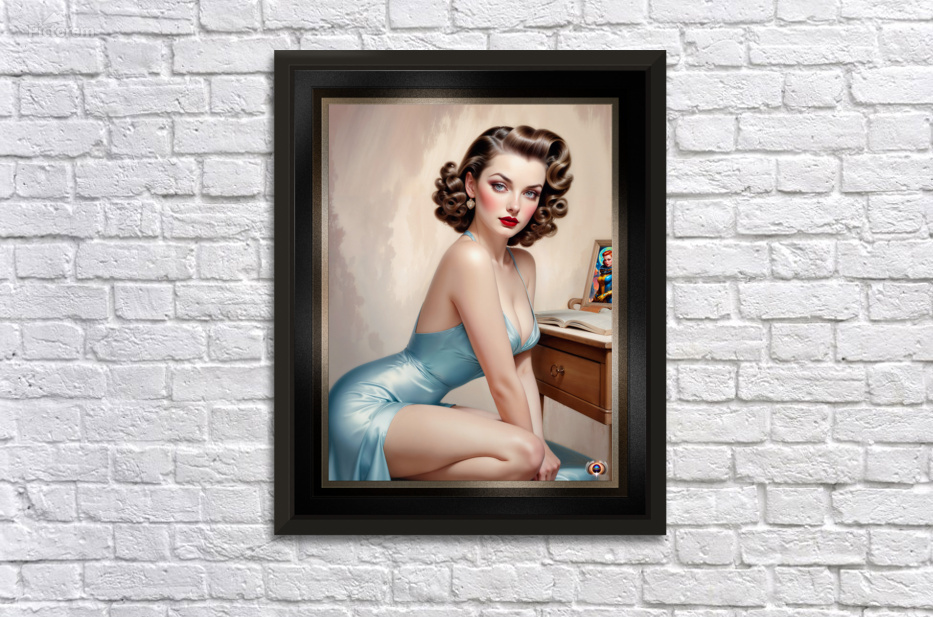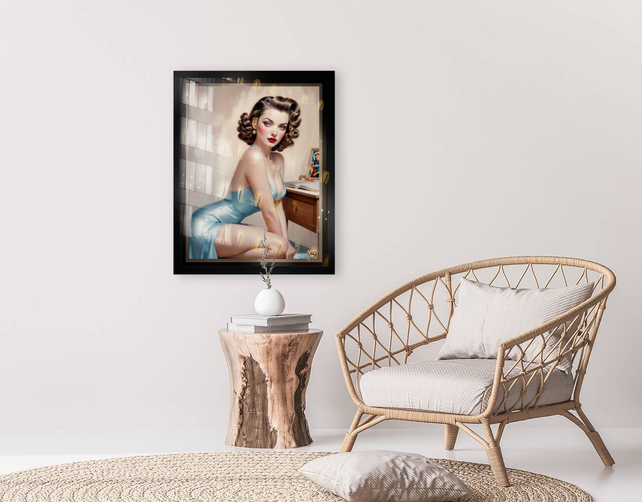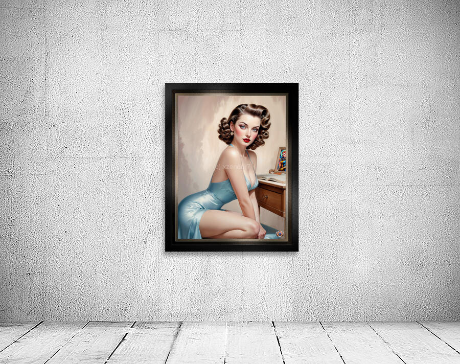 Elegant Pin-Up Girl Beauty In Satin Blue Attire Reading At Her Vanity Mesmerizing AI Concept Art by Xzendor7 Wall Decor Frame