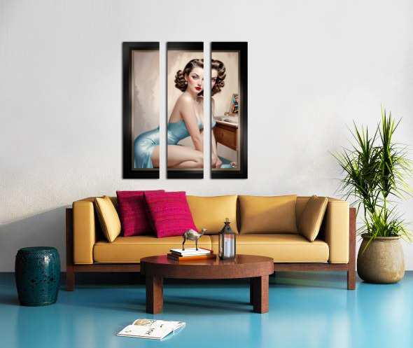 ELEGANT PIN-UP GIRL BEAUTY IN SATIN BLUE ATTIRE READING AT HER VANITY MESMERIZING AI CONCEPT ART BY XZENDOR7 XZENDOR7  Canvas Print