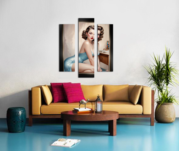 Elegant Pin-Up Girl Beauty In Satin Blue Attire Reading At Her Vanity Mesmerizing AI Concept Art by Xzendor7 Canvas print
