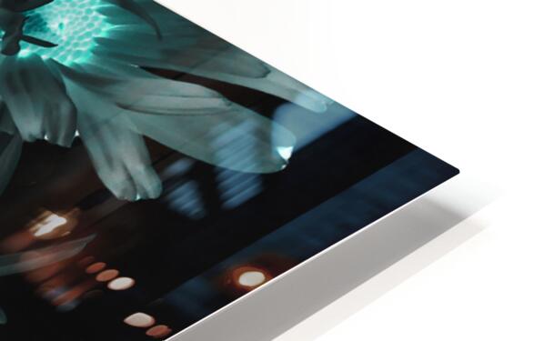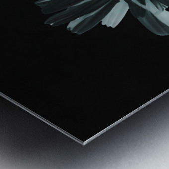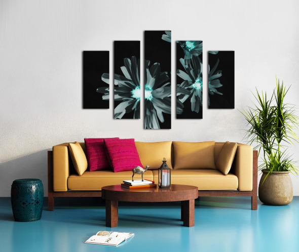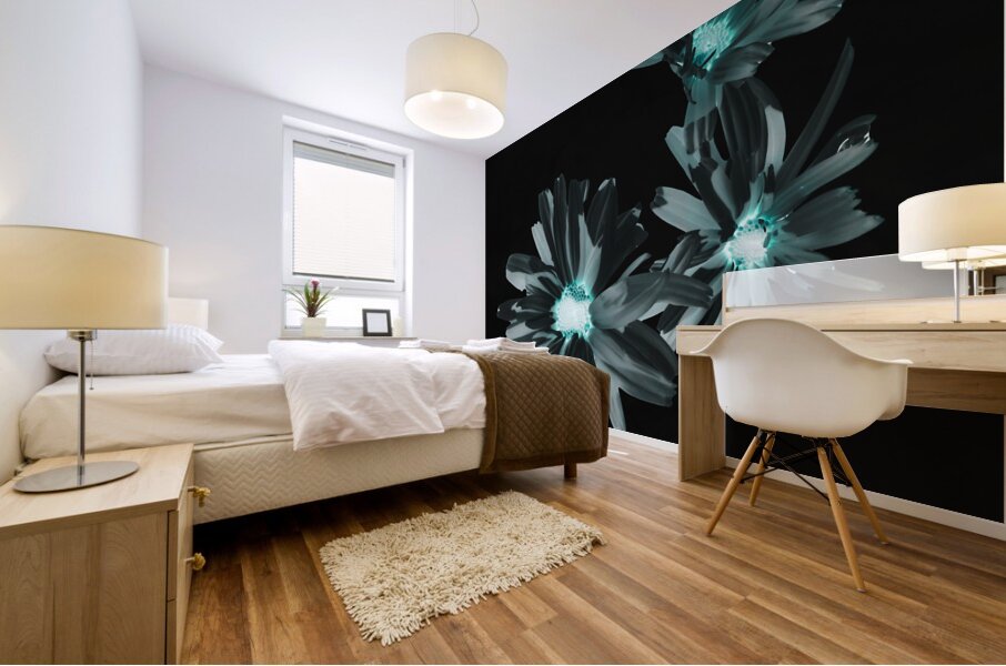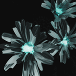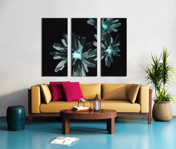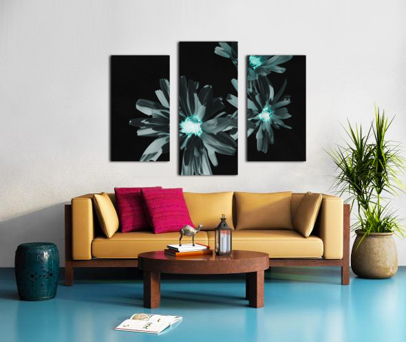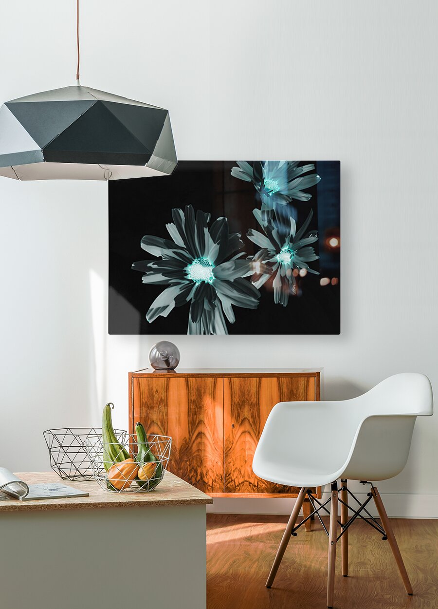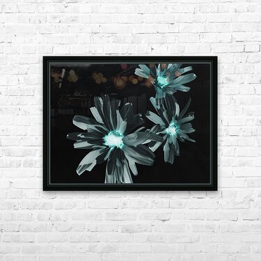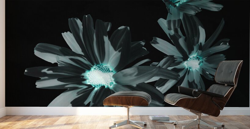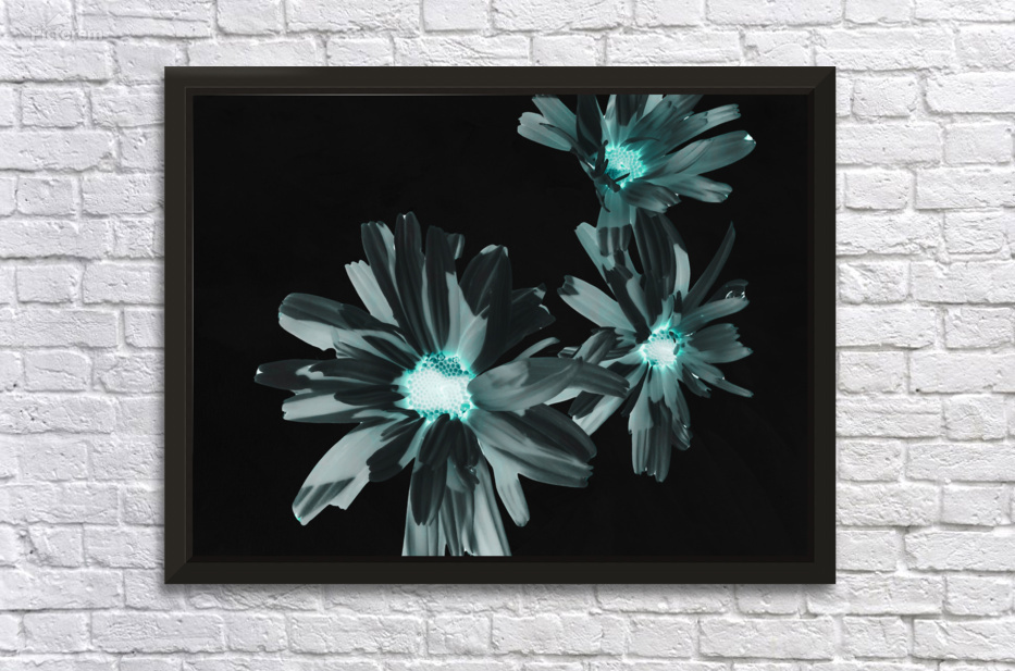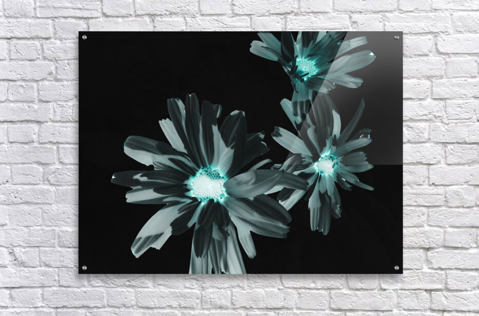 Once a close up photo of Daisy flower and a hand painted acrylic, laterally digitally combined and manipulated to create a stunning piece of contemporary art. Features a trio of Daisy flowers set against a dark background, with their petals glowing in a vibrant, luminescent turquoise color. The contrast between the dark and bright sections highlights the delicate structure of the blossoms.