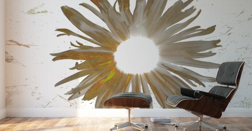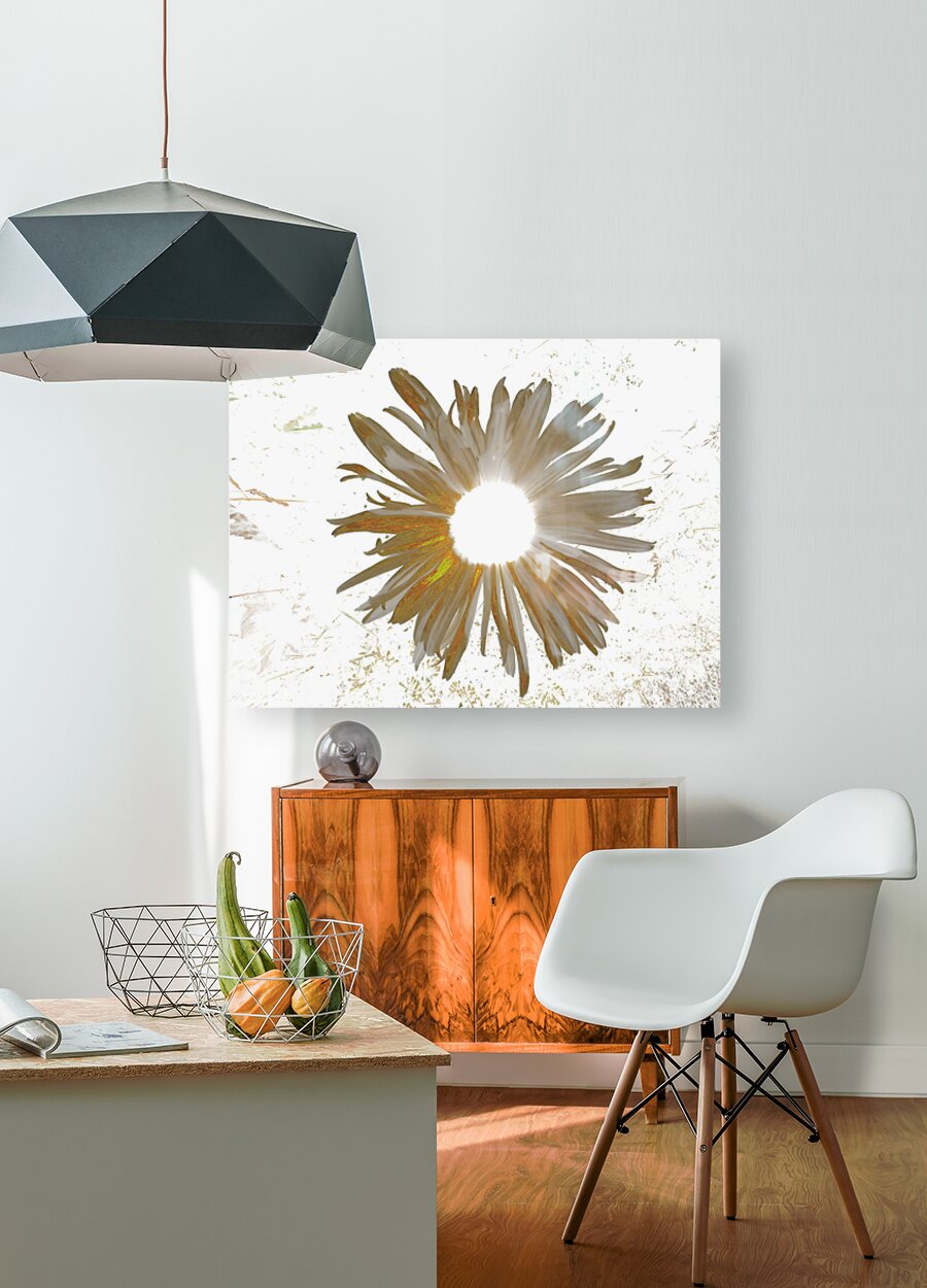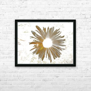 Originally a close up photo of a Daisy flower laterally digitally manipulated into a stunning piece of modern floral art. Features a vibrant yellow and white Daisy which appears to radiate light from it's center, and is surrounded by a bright, almost glowing backdrop. The petals are detailed and delicate, creating a sense of natural beauty and elegance.