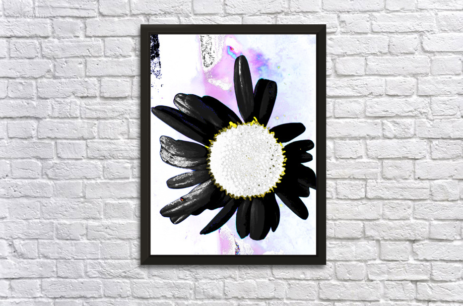 Originally a coloured photo of a Daisy flower laterally digitally manipulated into a stunning piece of contemporary floral art. Features a Daisy with black petals and a white center set against a pastel-colored background. The contrast between the dark petals and the light background highlights the flower's distinct shape and details.