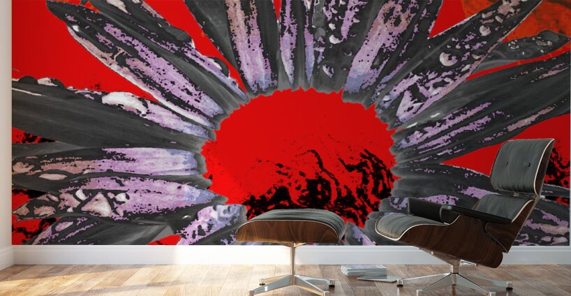 Originally two separate photos a close up of a Daisy flower and an abstract forest, laterally digitally manipulated in canva.com. Features a large, vibrant Daisy flower with purple petals and a red center set against a striking red and orange background. The petals have intricate patterns and textures that add depth to the composition.
