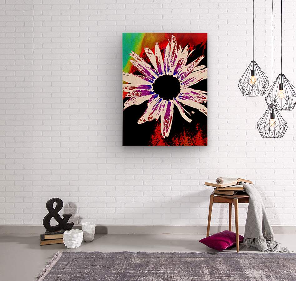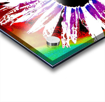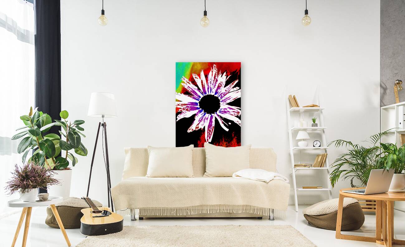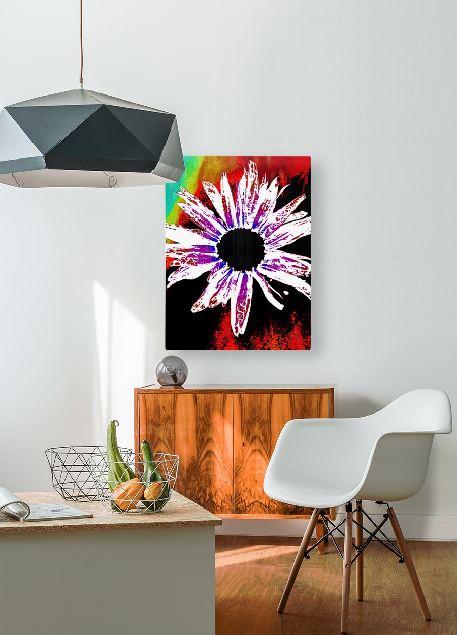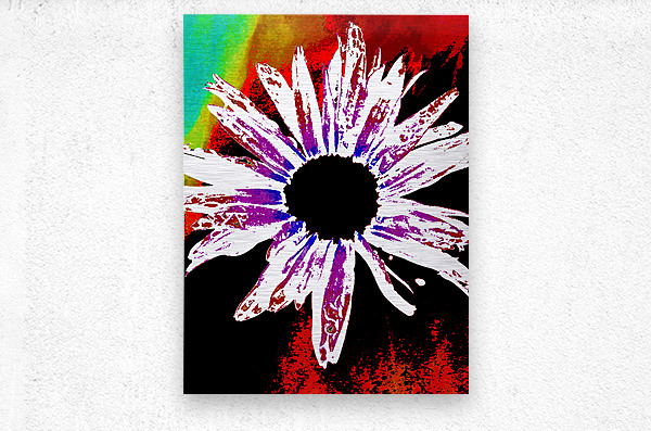 Originally a close up photo of a Daisy flower and a hand painted acrylic, laterally combined and digitally manipulated into this stunning piece of floral contemporary art. Features a vibrant Daisy with a large black center surrounded by white petals with purple accents. The background consists of a mix of red, green, and black colors, creating a striking contrast.