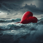 LARGE RED HEART PRECARIOUSLY DRIFTING IN TUMULTUO