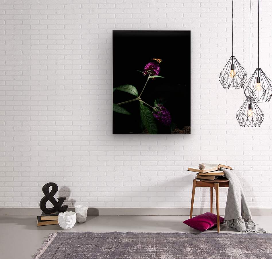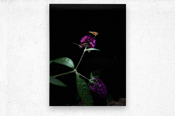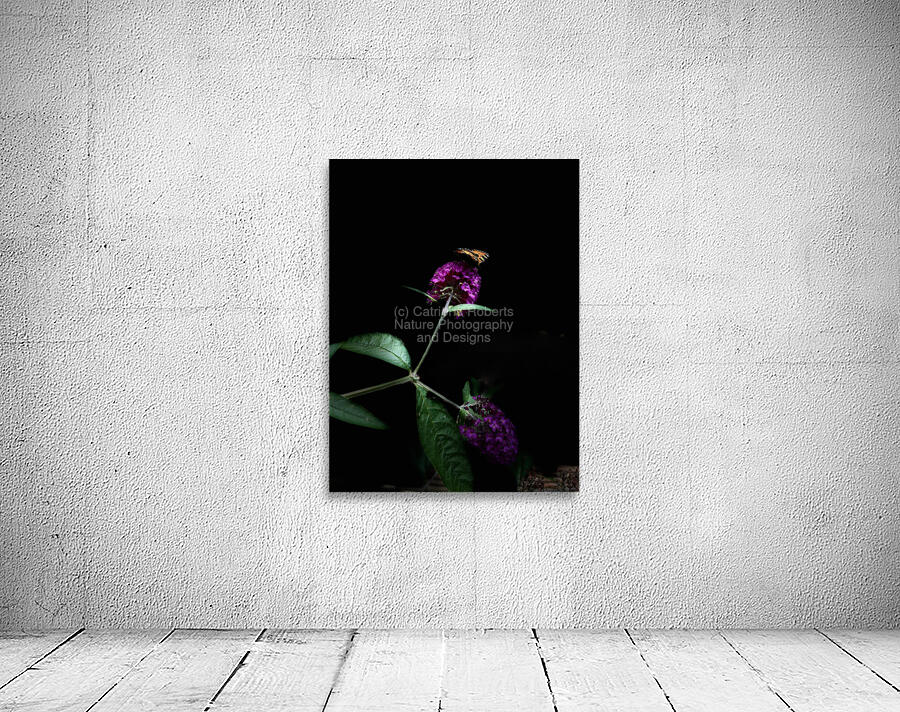 A coloured photo featuring a vibrant butterfly resting on a cluster of vivid purple Buddleia flowers, creates a striking contrast against the dark bac...[+]