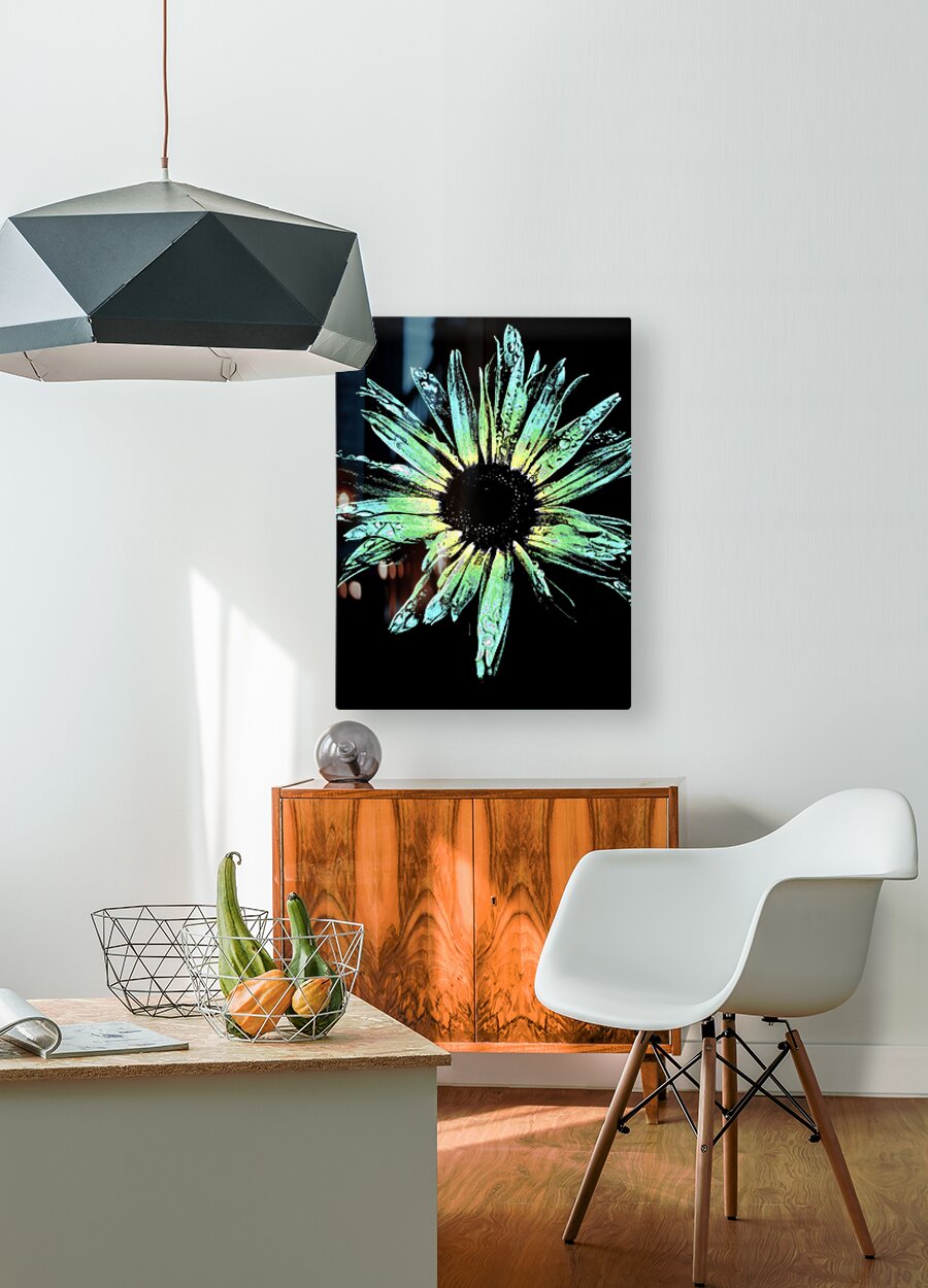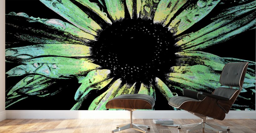 Originally a close up photo of a Daisy flower laterally digitally manipulated into a stunning piece of floral contemporary art. Features a stylized Daisy presented with a vibrant green and yellow color palette against a stark black background. The petals show detailed textures and droplets, giving it a lively and slightly abstract feel.