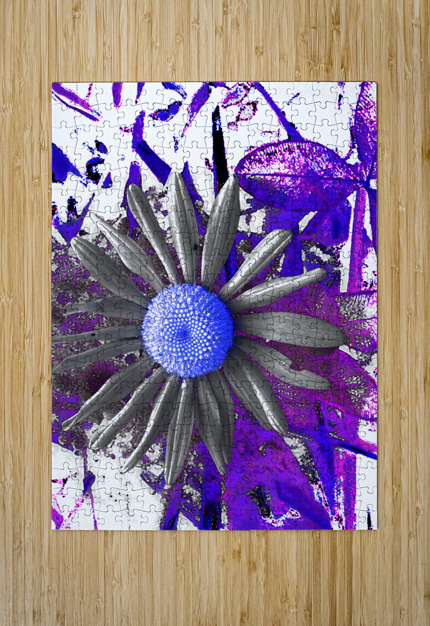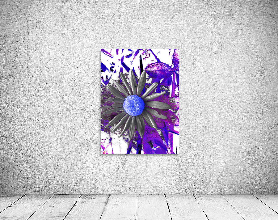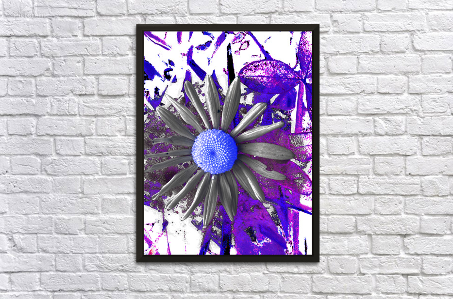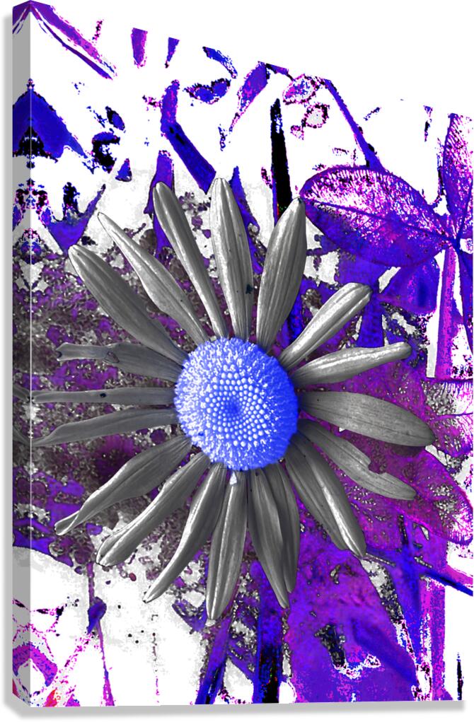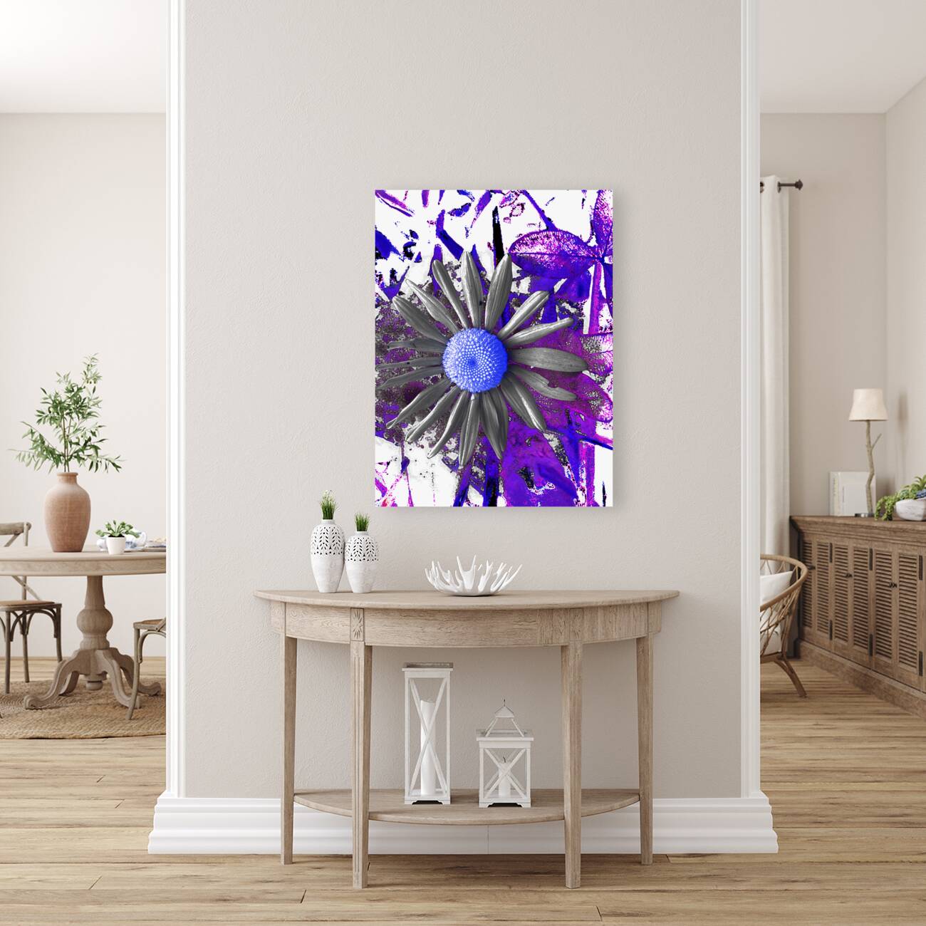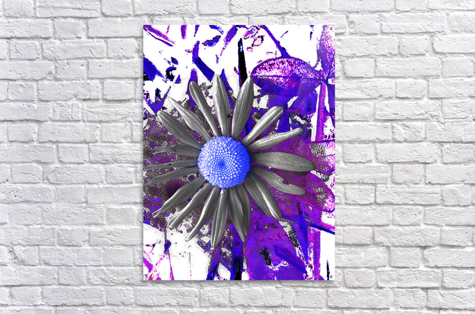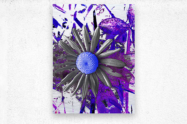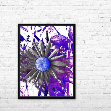 Originally a close up photo of a Daisy flower and a separate photo of foliage laterally digitally combined and further manipulated to create this stunning piece of floral contemporary art. Features a vibrant Daisy with grey petals and a vivid blue center set against an abstract, multicolored background dominated by shades of purple and white. The contrast highlights the intricate details of the flower and surrounding foliage, creating a striking visual impact.
