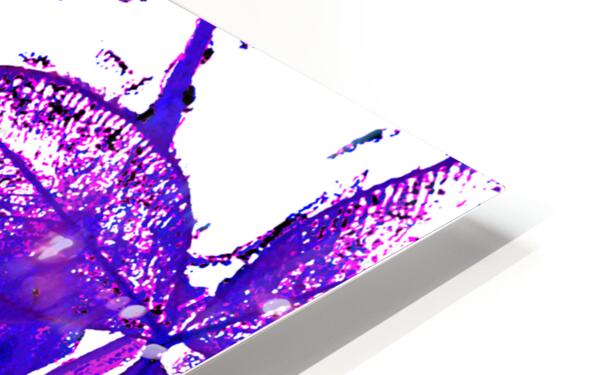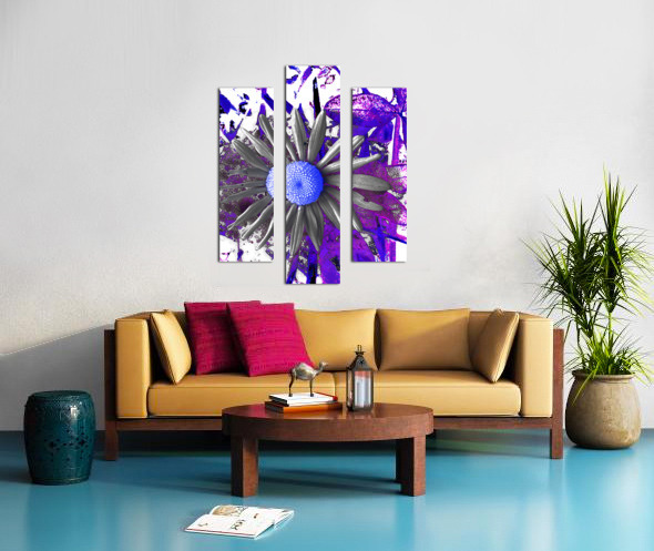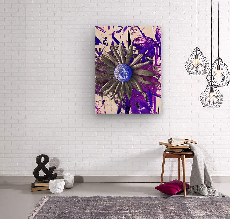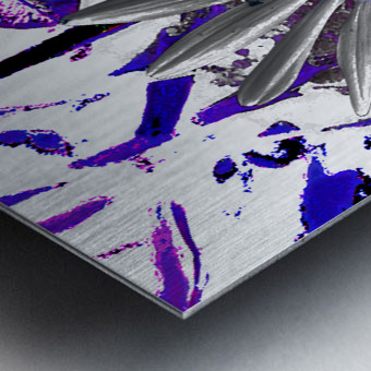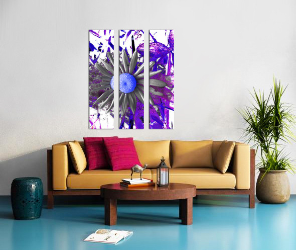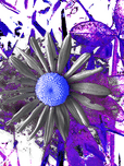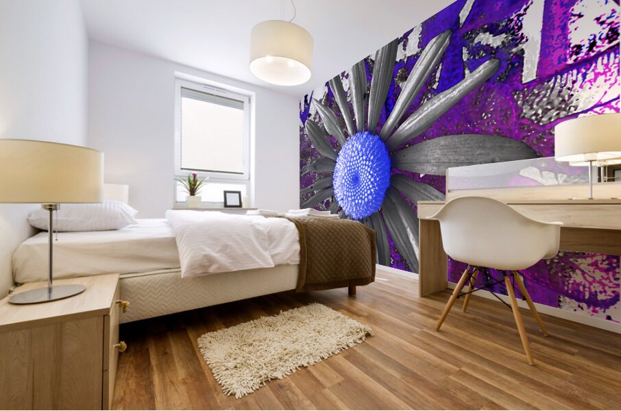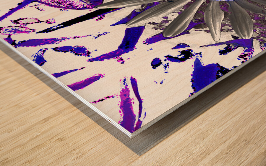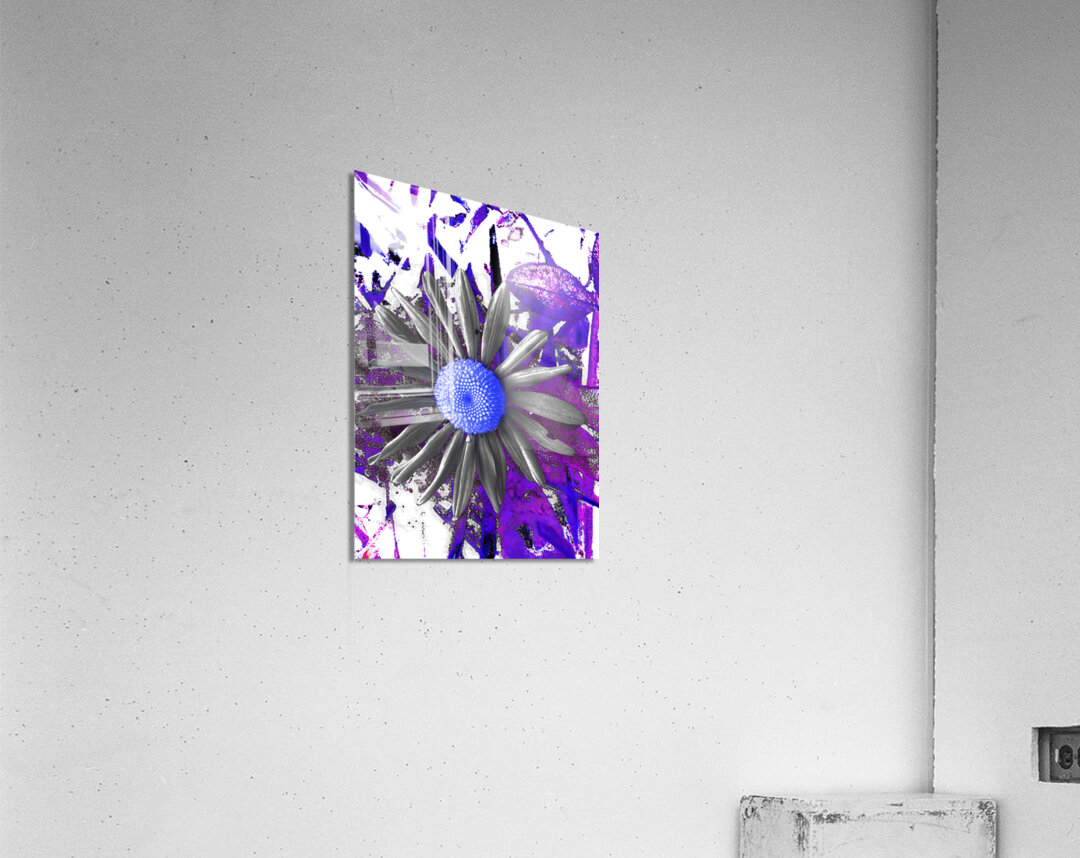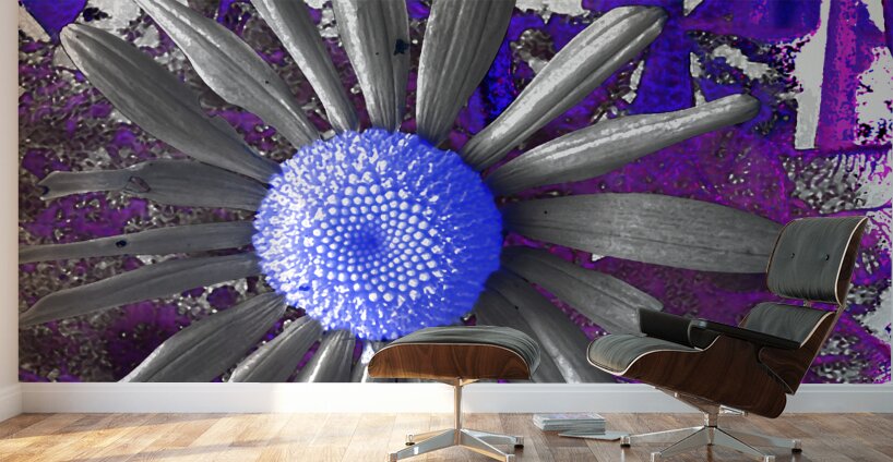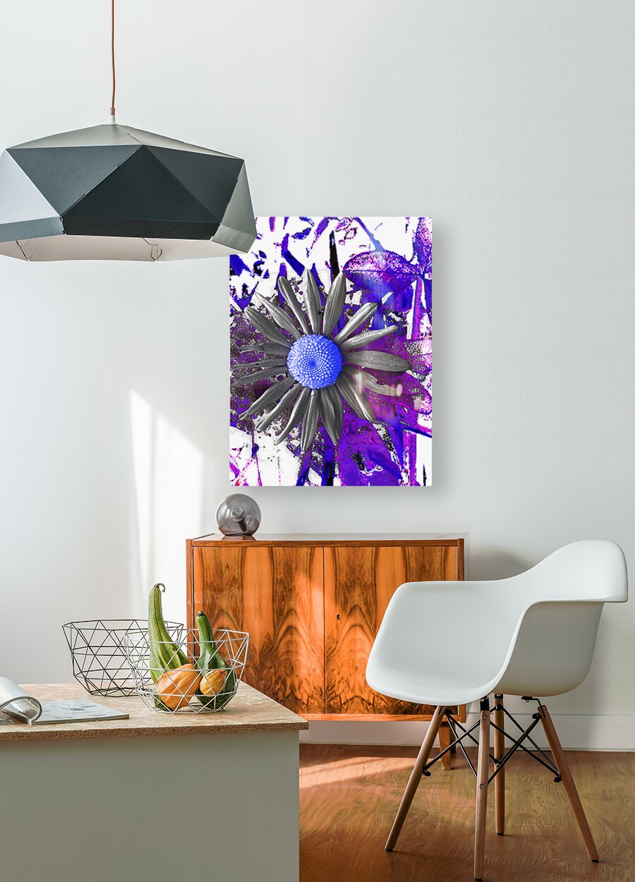 Originally a close up photo of a Daisy flower and a separate photo of foliage laterally digitally combined and further manipulated to create this stunning piece of floral contemporary art. Features a vibrant Daisy with grey petals and a vivid blue center set against an abstract, multicolored background dominated by shades of purple and white. The contrast highlights the intricate details of the flower and surrounding foliage, creating a striking visual impact.