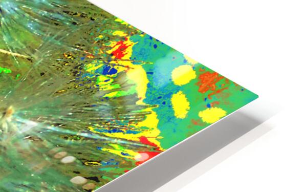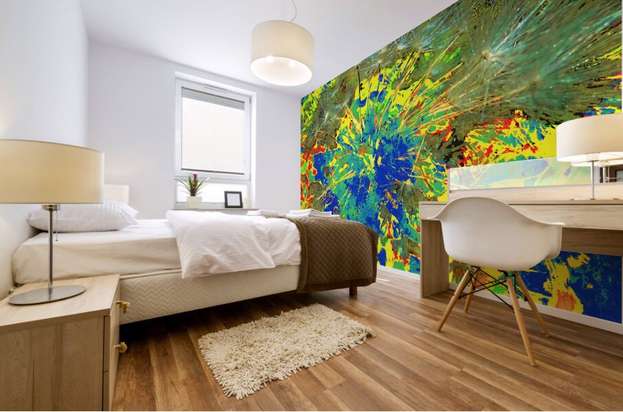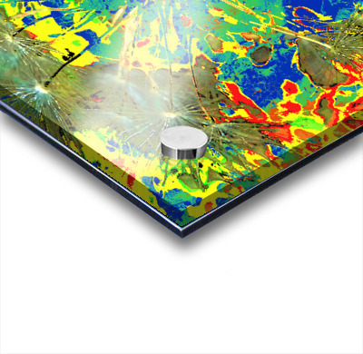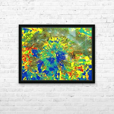 Originally a close up photo of Dandelion Seeds and a separate photo of a tree through a rain soaked window. Laterally both combined and further digitally enhanced into a stunning abstract nature inspired design. Features vibrant colors splashed across the canvas, with hues of blue, green, yellow, and red creating an abstract pattern. Dandelion seeds appear to explode from the center, adding dynamism to the composition.