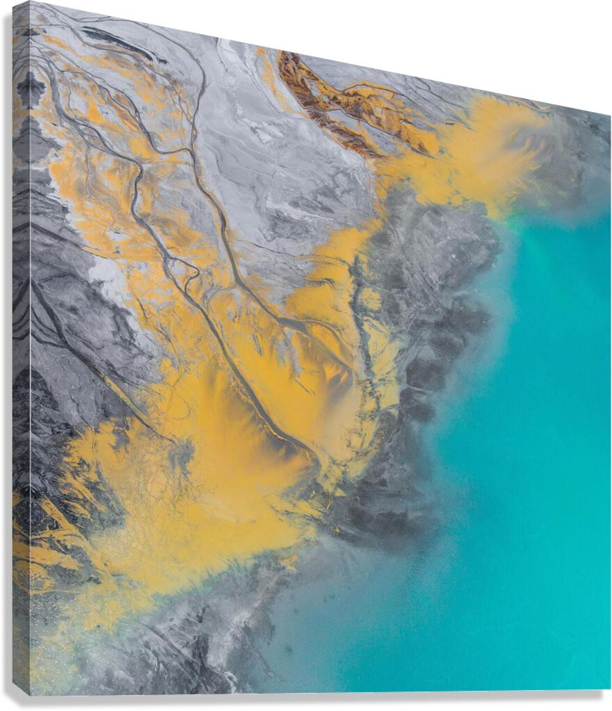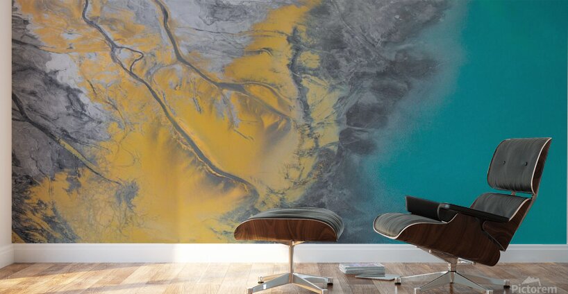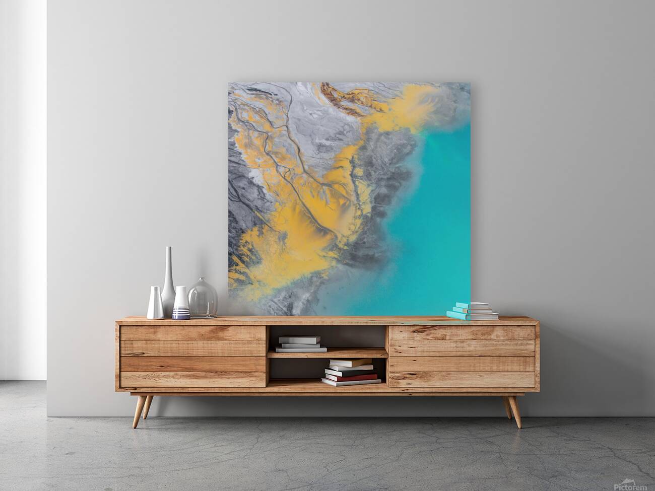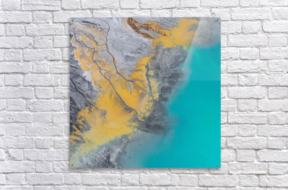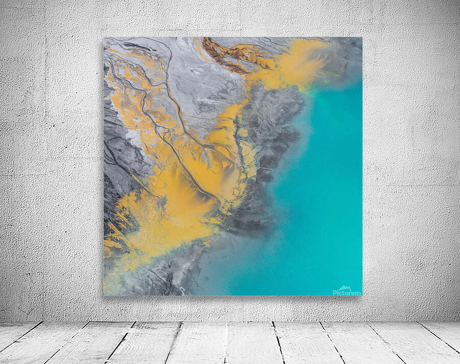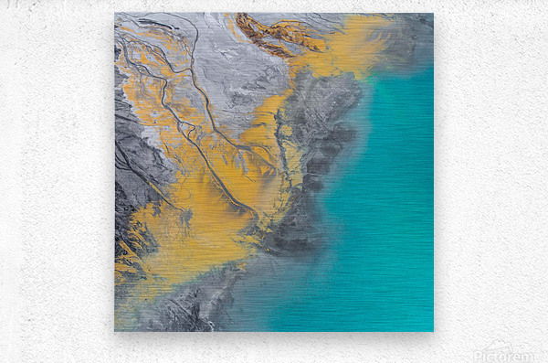 "Erosion's Embrace" is an abstract artwork that captures the delicate balance between nature's raw power and serene beauty. The composition evokes the imagery of an aerial landscape, where golden-yellow sands meet the rugged, weathered terrain, gradually blending into a tranquil turquoise body of water. The fluid transition from earthy tones to vibrant blue symbolizes the dynamic process of erosion, where the land is both shaped and reclaimed by the elements. The artist masterfully contrasts the soft curves of the shoreline with the intricate, vein-like patterns of the terrain, creating a visual narrative that speaks to the perpetual interaction between land and water. This piece invites viewers to reflect on the passage of time and the ever-changing face of our planet, seen through the lens of abstract interpretation.