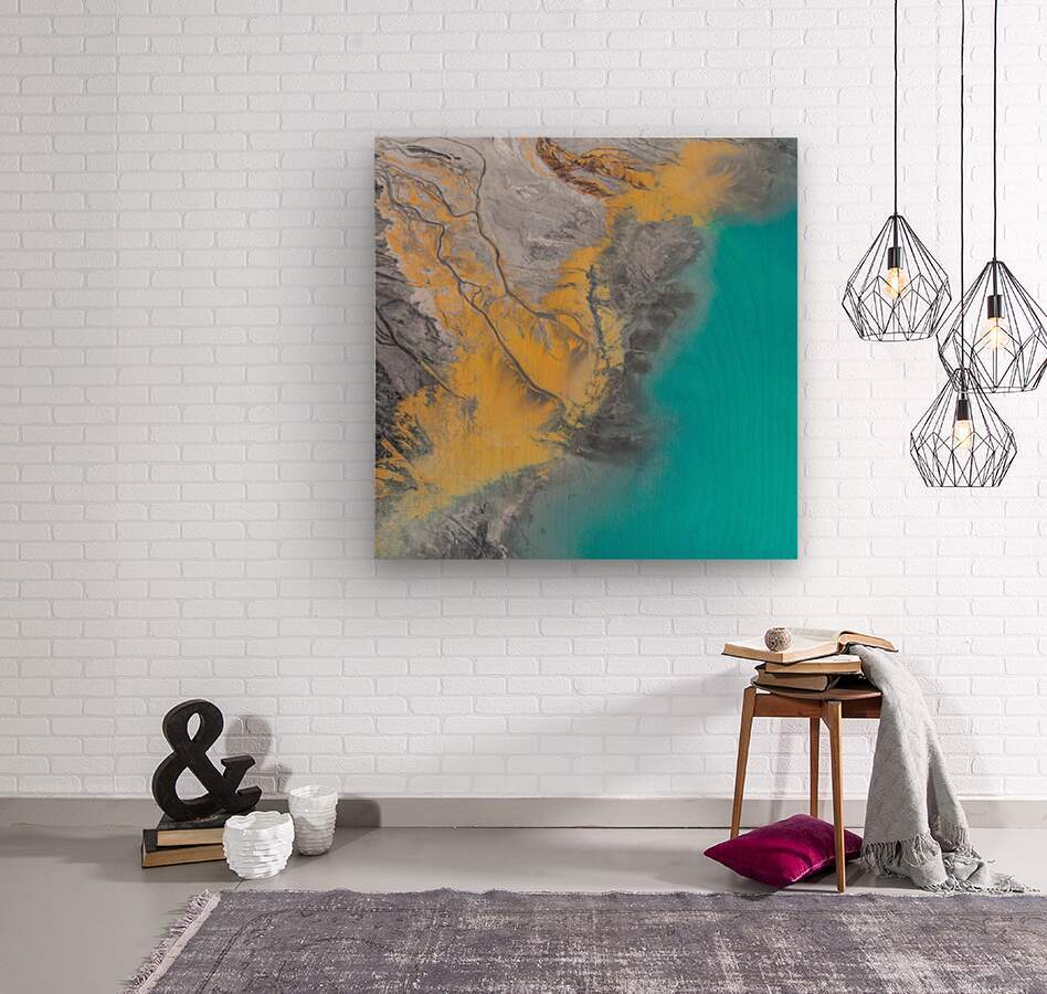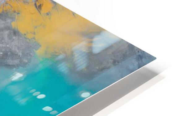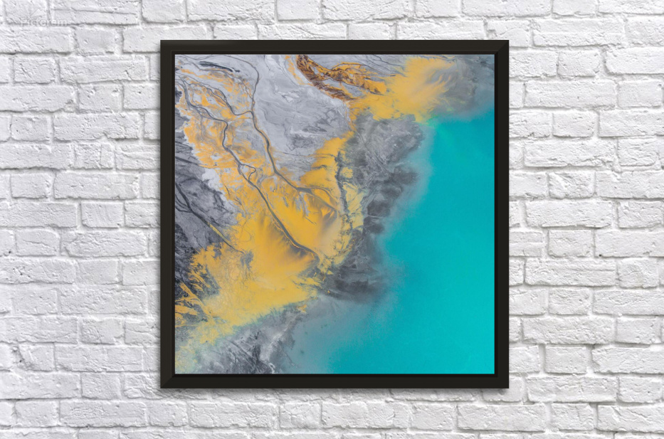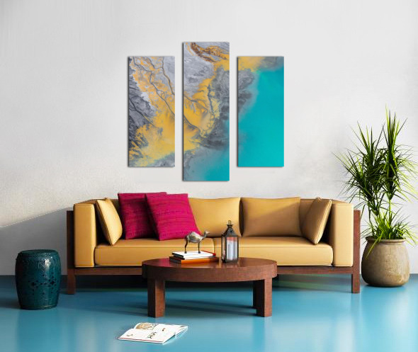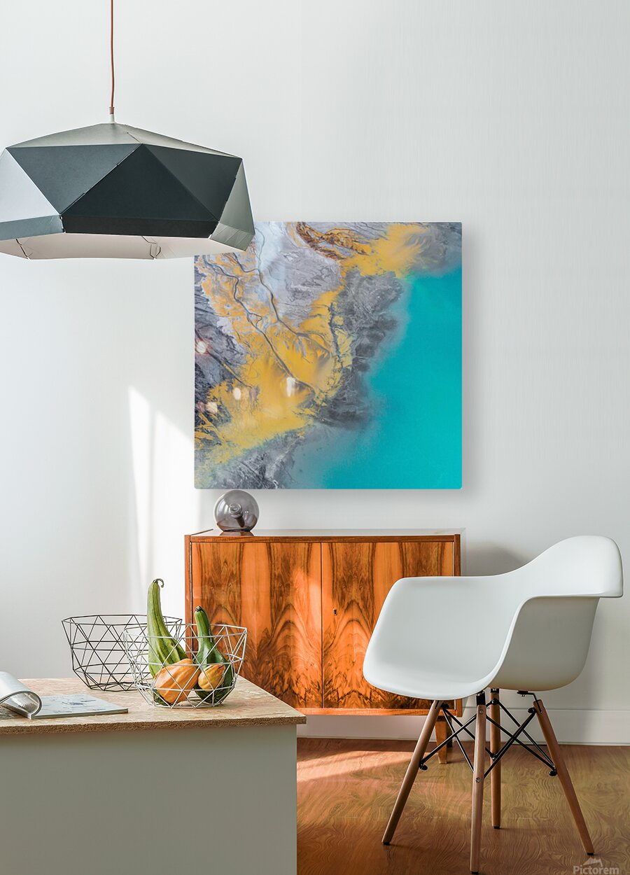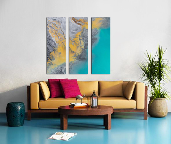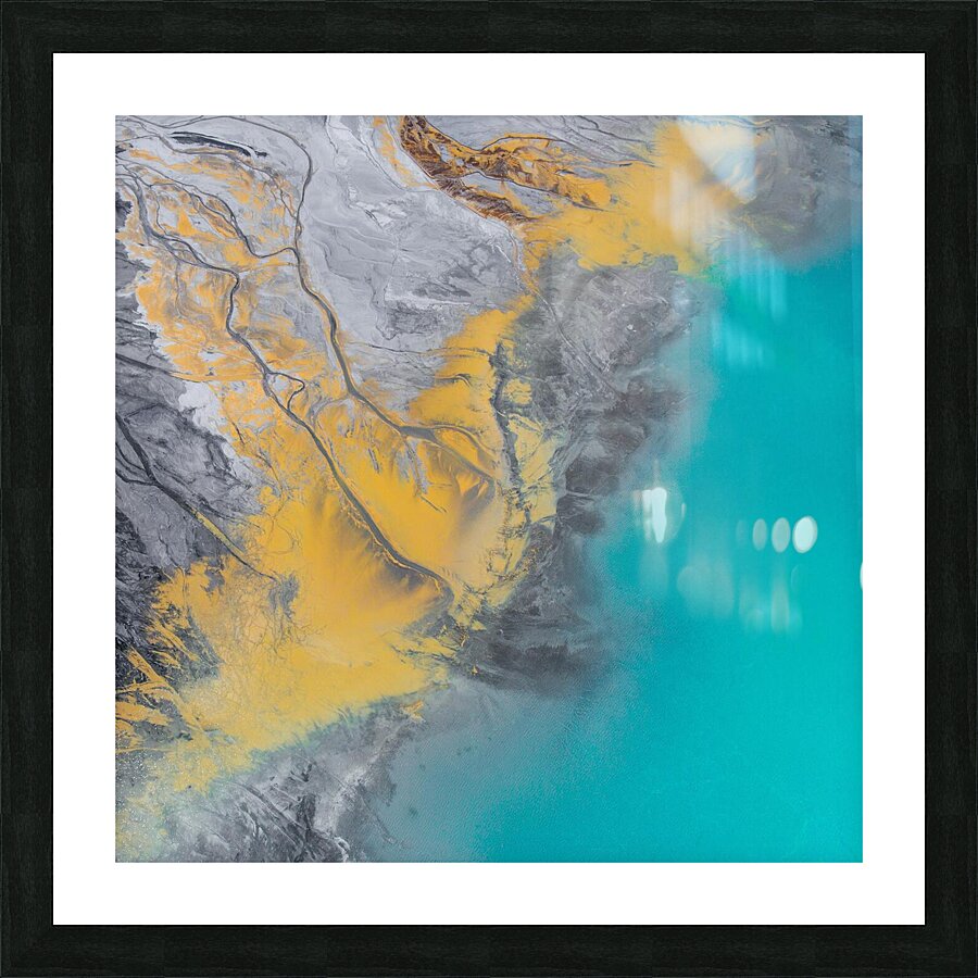 "Erosion's Embrace" is an abstract artwork that captures the delicate balance between nature's raw power and serene beauty. The composition evokes the imagery of an aerial landscape, where golden-yellow sands meet the rugged, weathered terrain, gradually blending into a tranquil turquoise body of water. The fluid transition from earthy tones to vibrant blue symbolizes the dynamic process of erosion, where the land is both shaped and reclaimed by the elements. The artist masterfully contrasts the soft curves of the shoreline with the intricate, vein-like patterns of the terrain, creating a visual narrative that speaks to the perpetual interaction between land and water. This piece invites viewers to reflect on the passage of time and the ever-changing face of our planet, seen through the lens of abstract interpretation.
