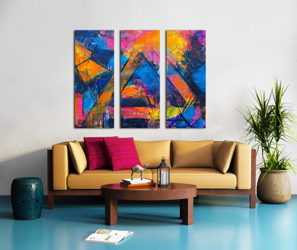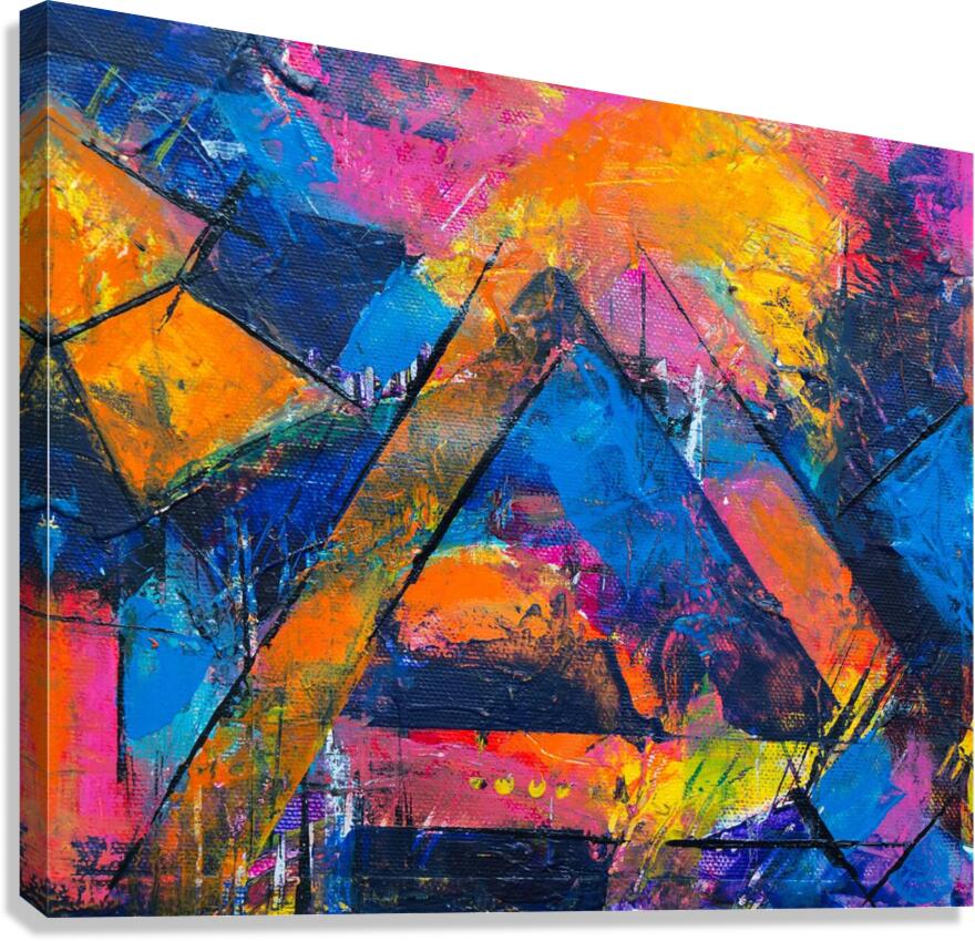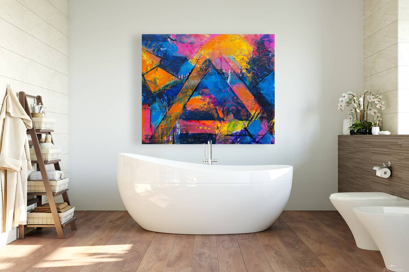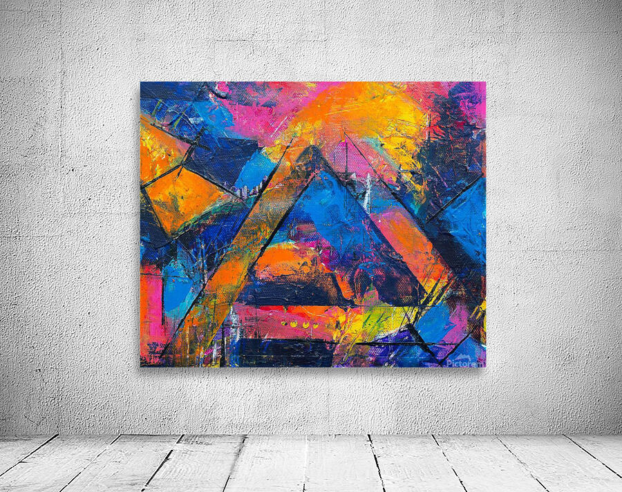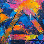 "Geometric Symphony" is a dynamic abstract artwork that merges bold geometric forms with a riot of vibrant colors. The piece features sharp, angular shapes that intersect and overlap, creating a complex web of lines and planes. The use of intense colors—ranging from fiery oranges and yellows to deep blues and purples—imbues the composition with a sense of energy and movement. The textured brushstrokes add depth and dimension, making the colors appear as though they are pulsating with life. This artwork invites viewers to explore the interplay between structure and spontaneity, where rigid geometric forms are balanced by the free-flowing application of paint. It is a celebration of contrasts—both in form and color—resulting in a visually captivating and emotionally engaging piece.