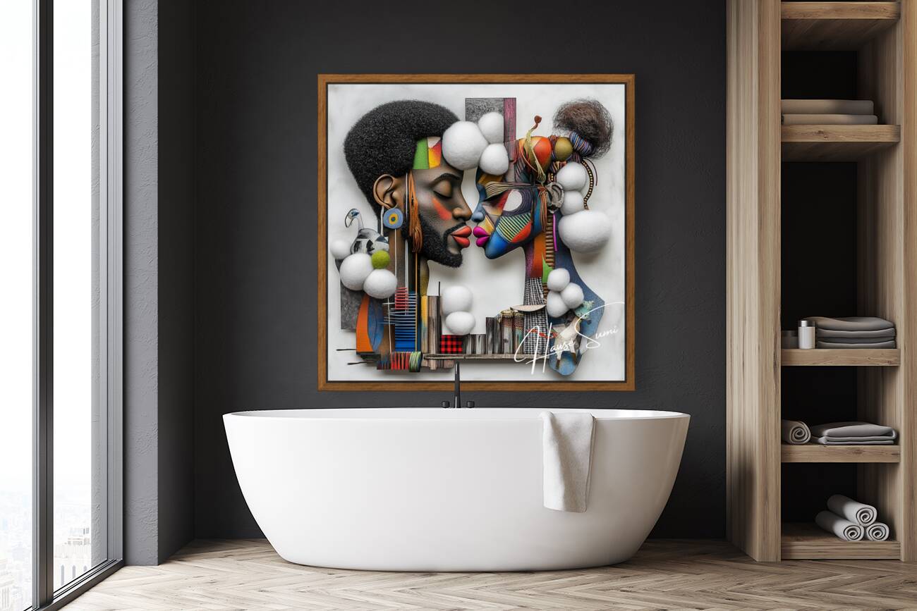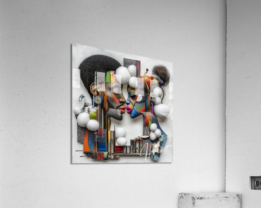 A man and woman share an intimate moment, their faces close as if exchanging a sacred secret passed down through generations. The cotton balls framing them evoke the softness of whispered words, binding their shared heritage with threads of love and understanding.