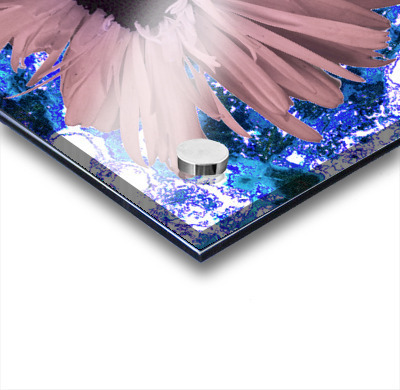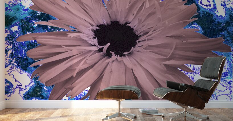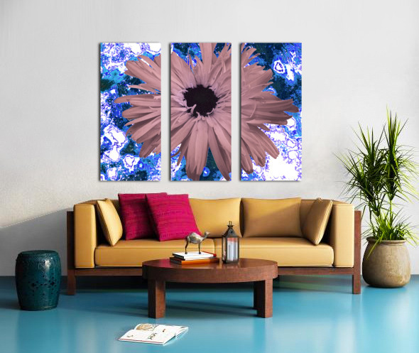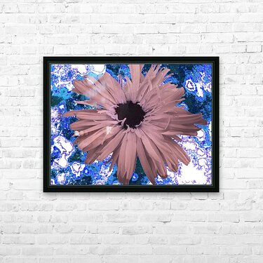 Originally a close up photo of a Daisy flower and an abstract photo of a tree through a rain soaked window laterally digitally combined and further enhanced to create this stunning piece of floral contemporary art. Features a single large Daisy with pinkish petals positioned against a vibrant abstract background filled with shades of blue and white. The center of the flower is dark, creating a strong contrast to the petals and the background.