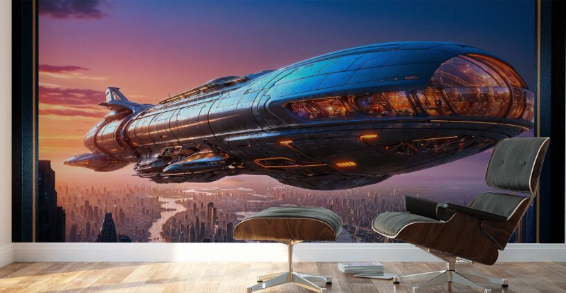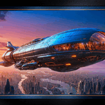 A futuristic airship hovers above a sprawling cityscape at sunset, with skyscrapers and winding rivers visible below. The vessel's sleek design an...[+]