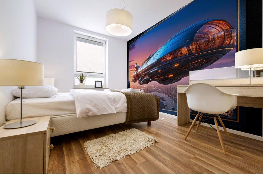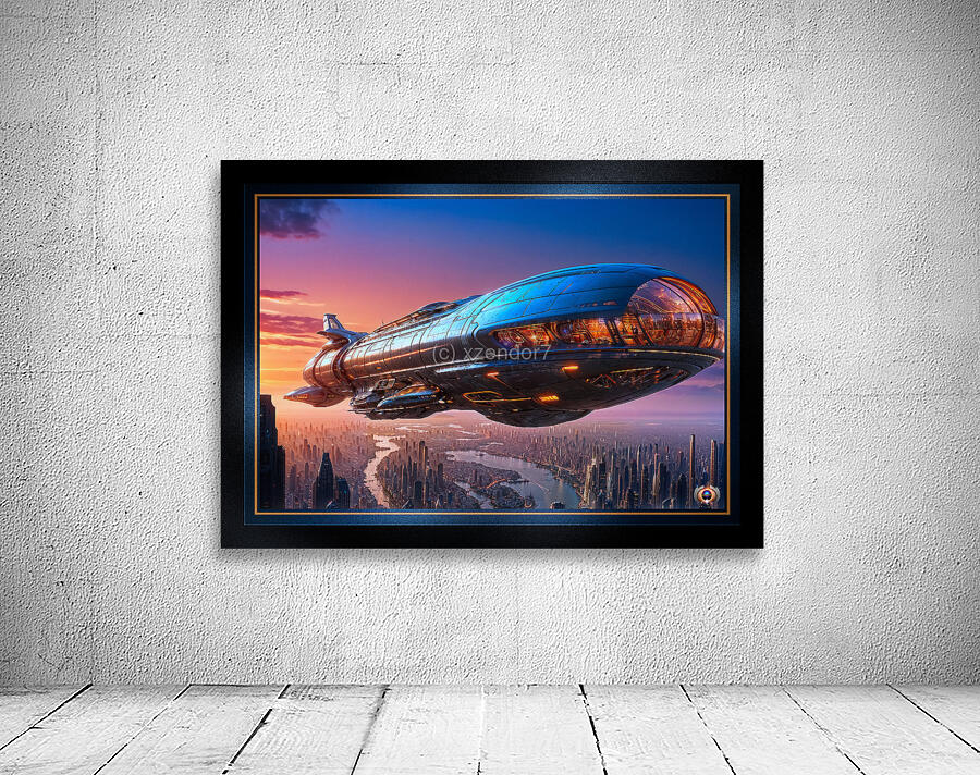 Get this artwork "Tourlan Shuttle Futuristic Airship Over Modern Metropolis At Sunset Captivating AI Concept Art by Xzendor7" in a framed print.