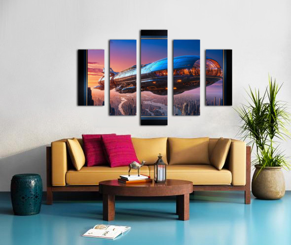 Tourlan Shuttle Futuristic Airship Over Modern Metropolis At Sunset Captivating AI Concept Art by Xzendor7 Canvas print