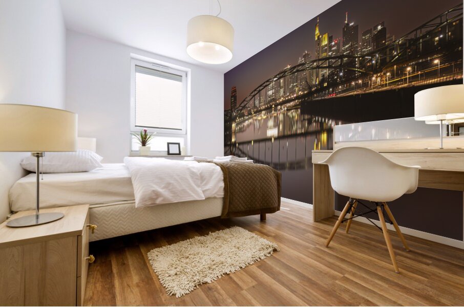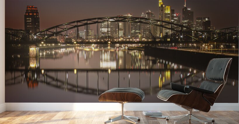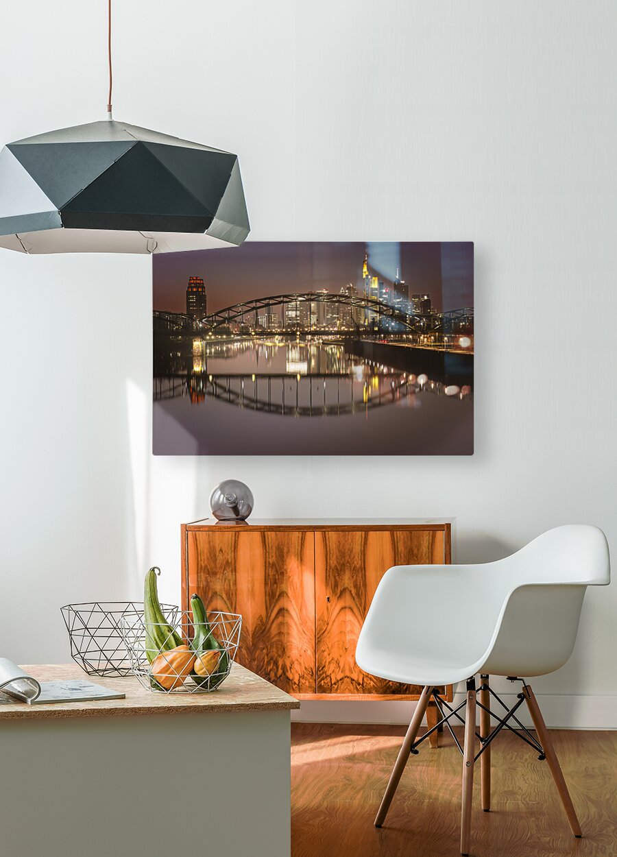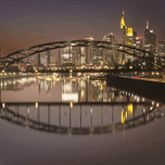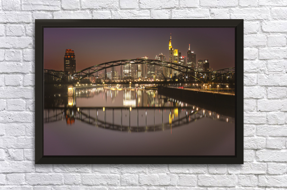 A stunning sunset horizon photograph of the Main River Frankfurt, Germany and her skyline at night in muted colors framed by her scenic riverfront lights, series of bridges and skyscrapers poking into the heavenly sky overhead. What a great remembrance of a vacation to this beautiful city.