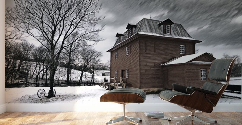 "Merry Christmas," Pictured as a computer generated charcoal sketch on my original captured photo of the Big Otter Mill in Bedford, Virginia in winter with snow. This iconic red, old mill has been restored and is a beautiful example of a red old gristmill.