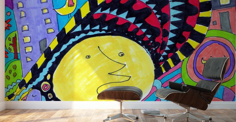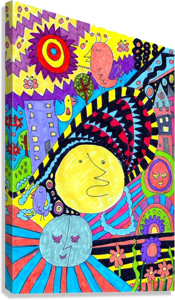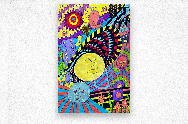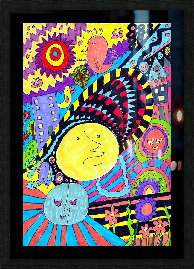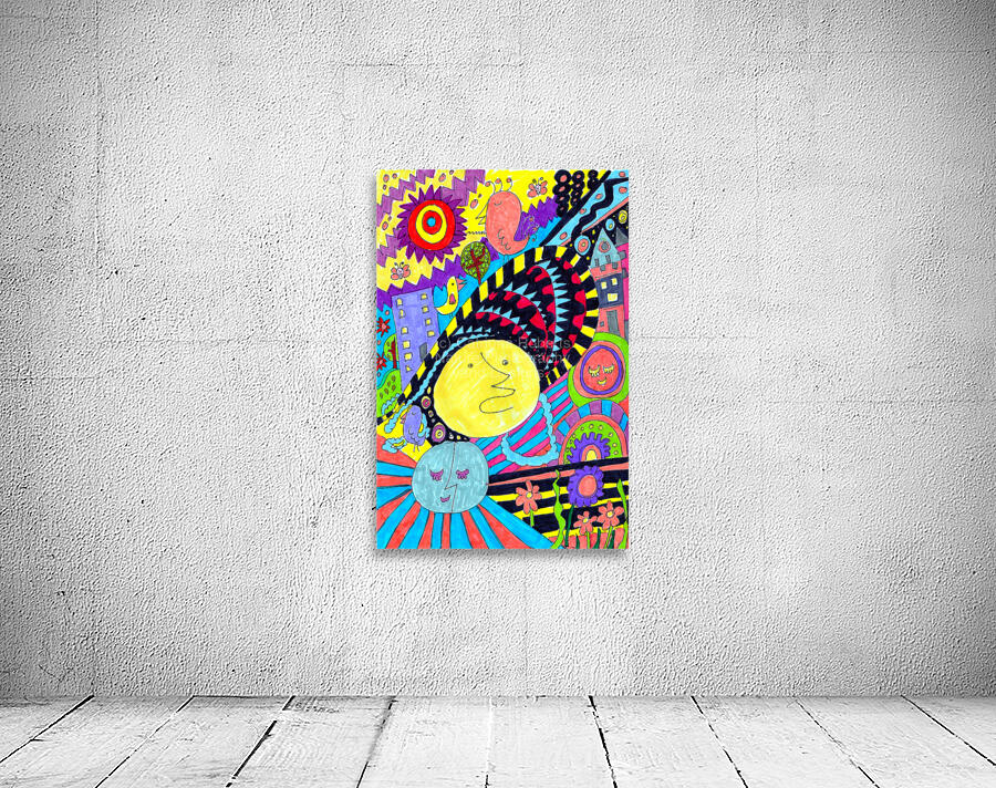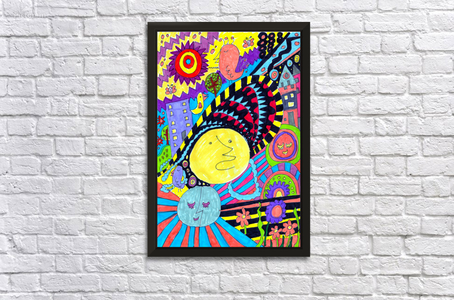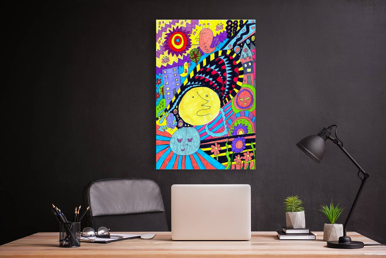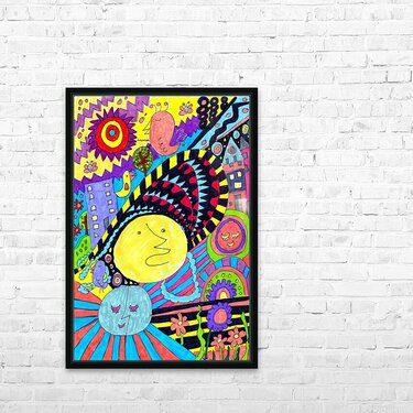A hand drawn design, created from imagination using coloured ink pens and paper. Features vibrant colors and whimsical shapes which dominate the scene...[+]