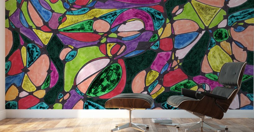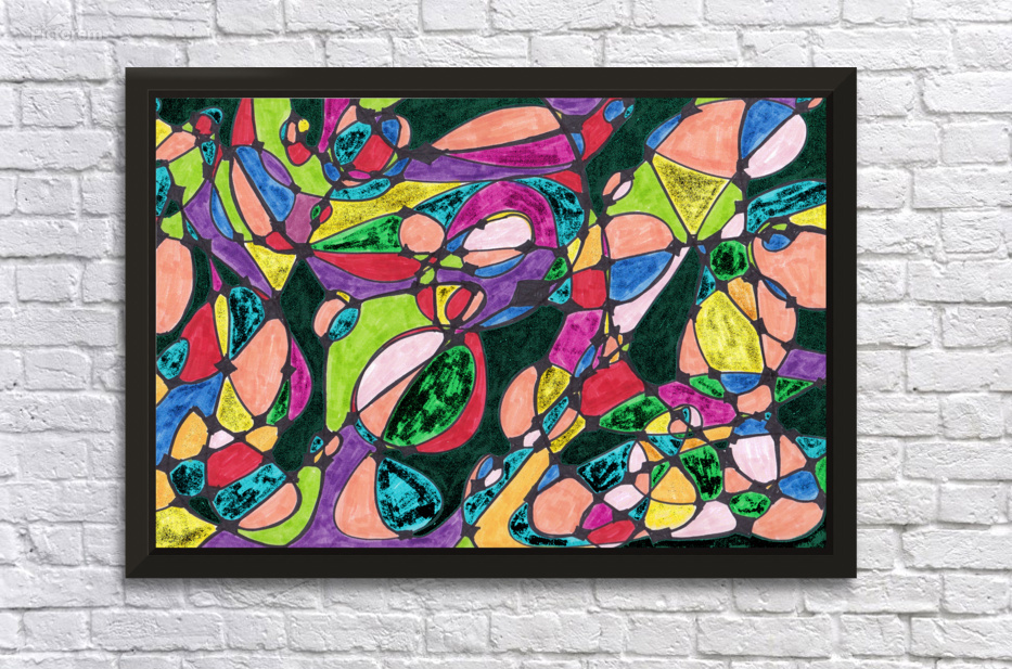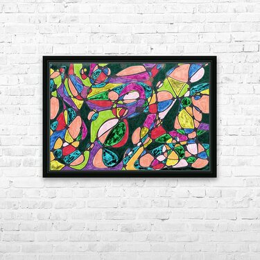 Once a hand drawn and hand painted abstract created using the neurographic method using coloured ink pens and paper. Laterally digitally manipulated into an impressive psychedelic design. Vibrantly colored shapes are intertwined in a complex pattern, creating a mosaic-like effect. Shades of pink, green, purple, and blue dominate the scene, bounded by bold black outlines that add contrast and definition.