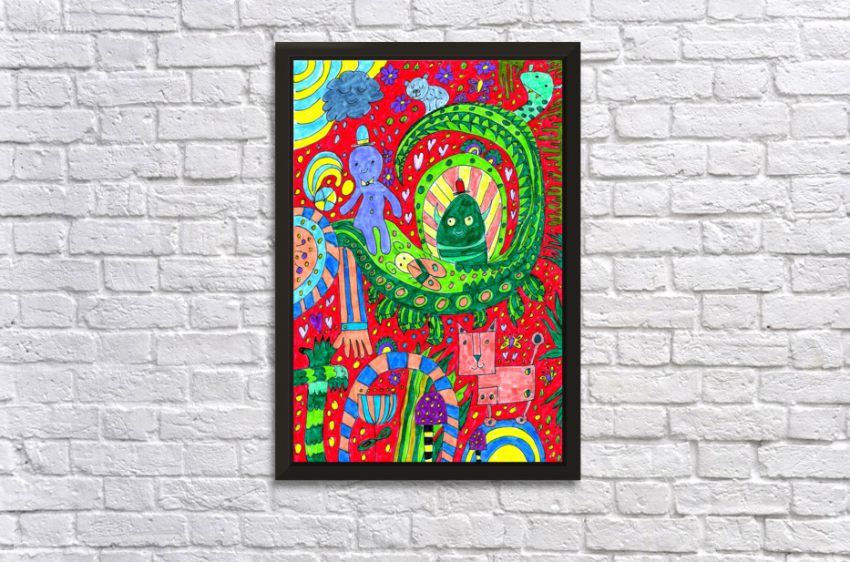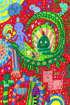 A hand drawn doodle inspired design created using coloured ink pens and paper. Features a vibrant, whimsical scene with playful characters , abstract ...[+]