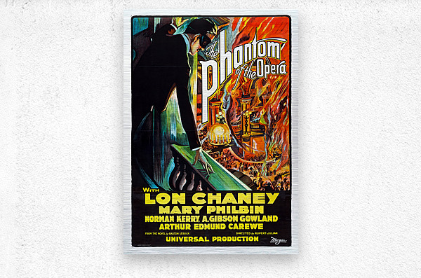 The vintage movie poster for “Phantom of the Opera” features a dramatic illustration with bold colors, predominantly black and green. The central ...[+]