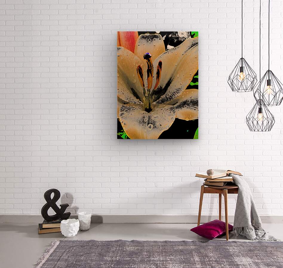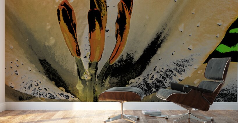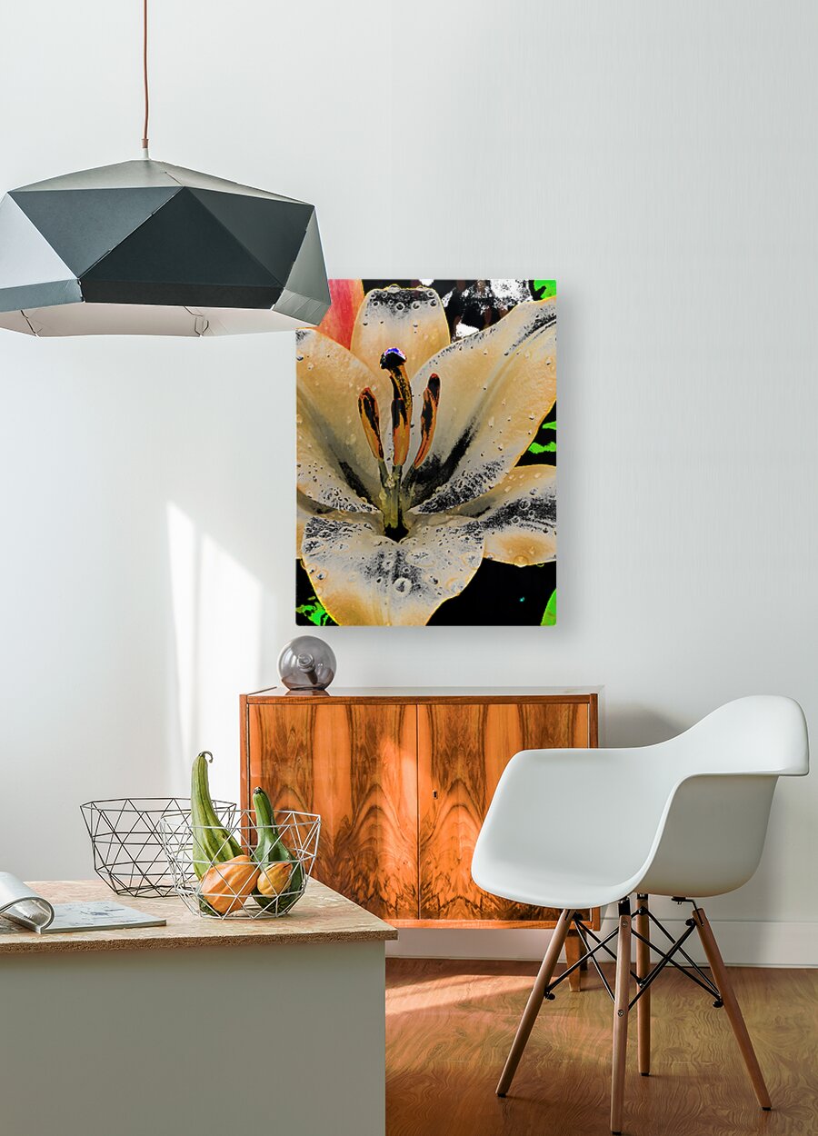 Originally a close up photo of a Lily flower laterally digitally manipulated into a striking piece of floral contemporary art. Features a close-up of a Lily which displays petals covered in droplets of water. The vibrant colors and sharp contrasts create a visually striking effect.