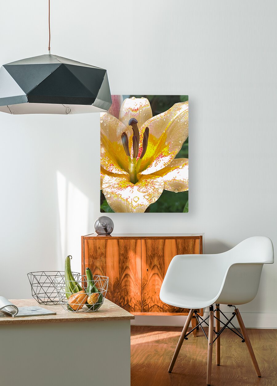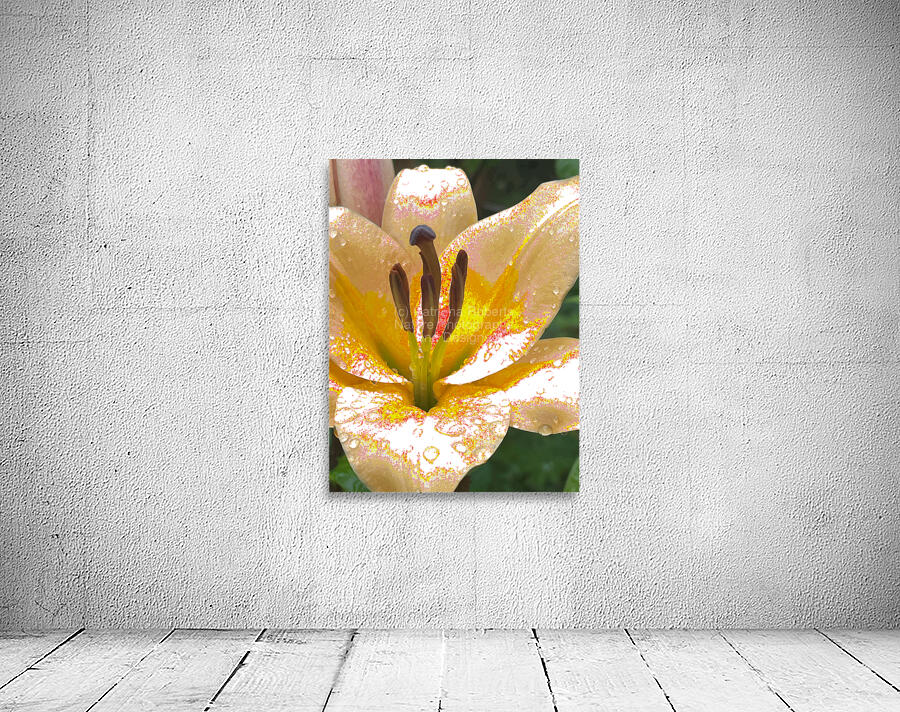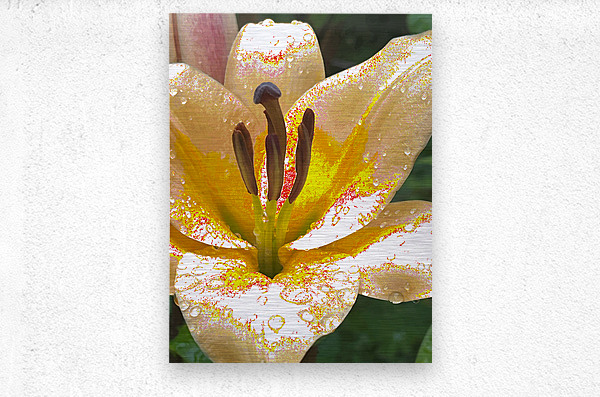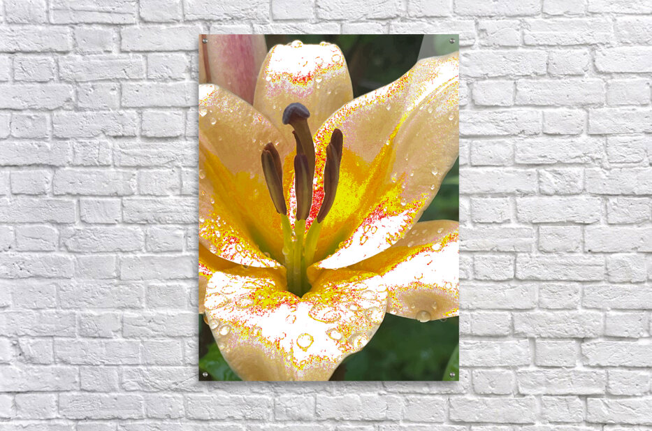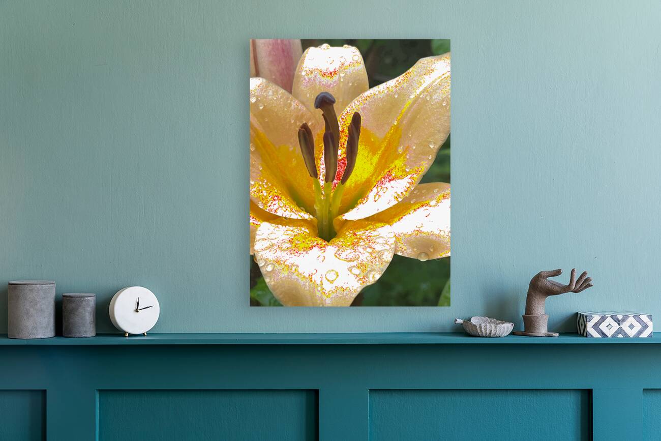 Originally a close up photo of a Lily flower laterally digitally manipulated into a stunning piece of contemporary floral art. Features a close-up view of a Lily covered in water droplets, showcasing its vibrant colors and intricate details. The petals reveal shades of yellow with hints of red and purple, with green foliage in the background.
