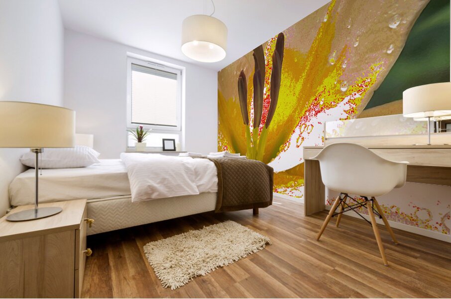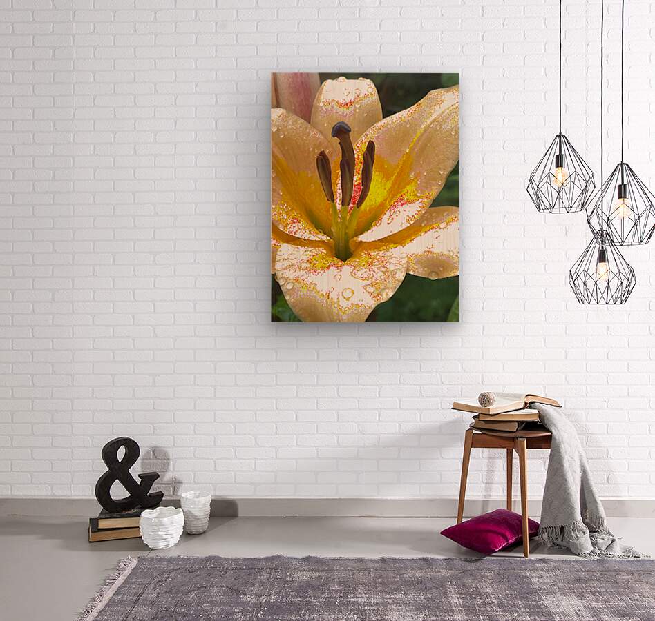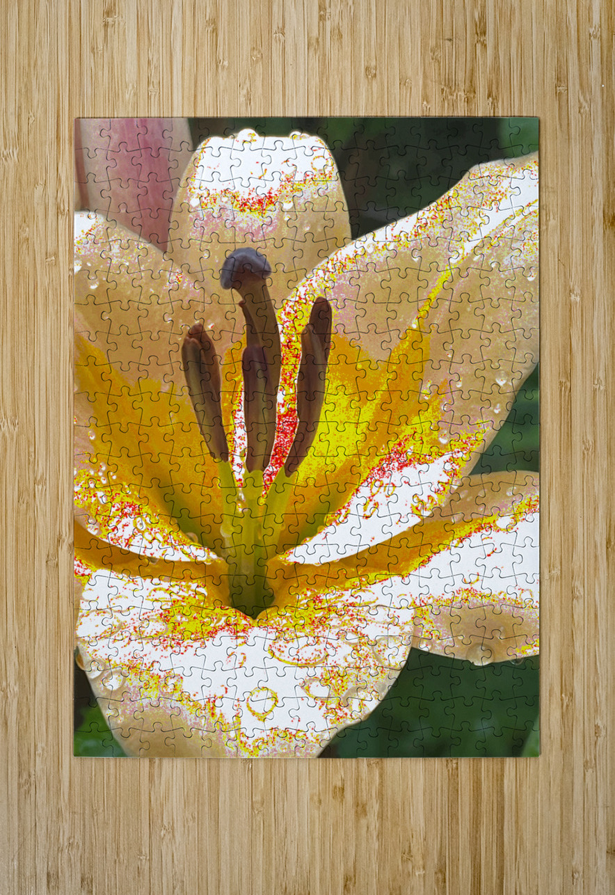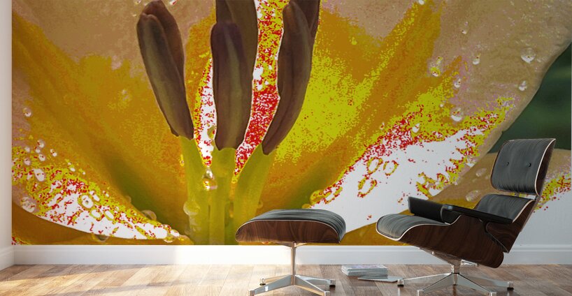 Originally a close up photo of a Lily flower laterally digitally manipulated into a stunning piece of contemporary floral art. Features a close-up view of a Lily covered in water droplets, showcasing its vibrant colors and intricate details. The petals reveal shades of yellow with hints of red and purple, with green foliage in the background.