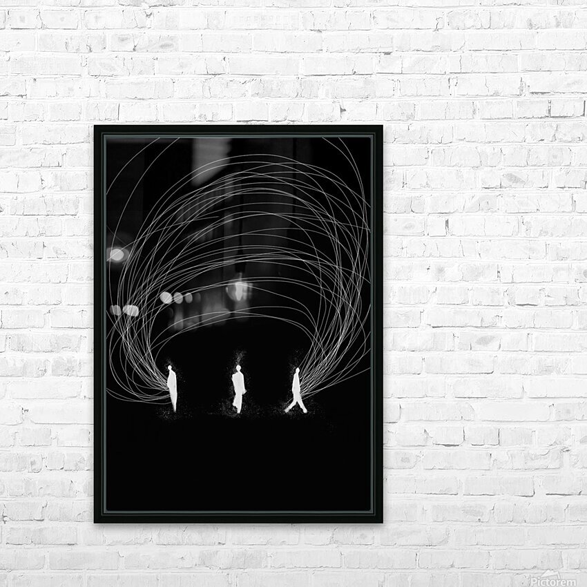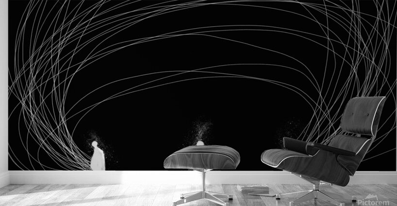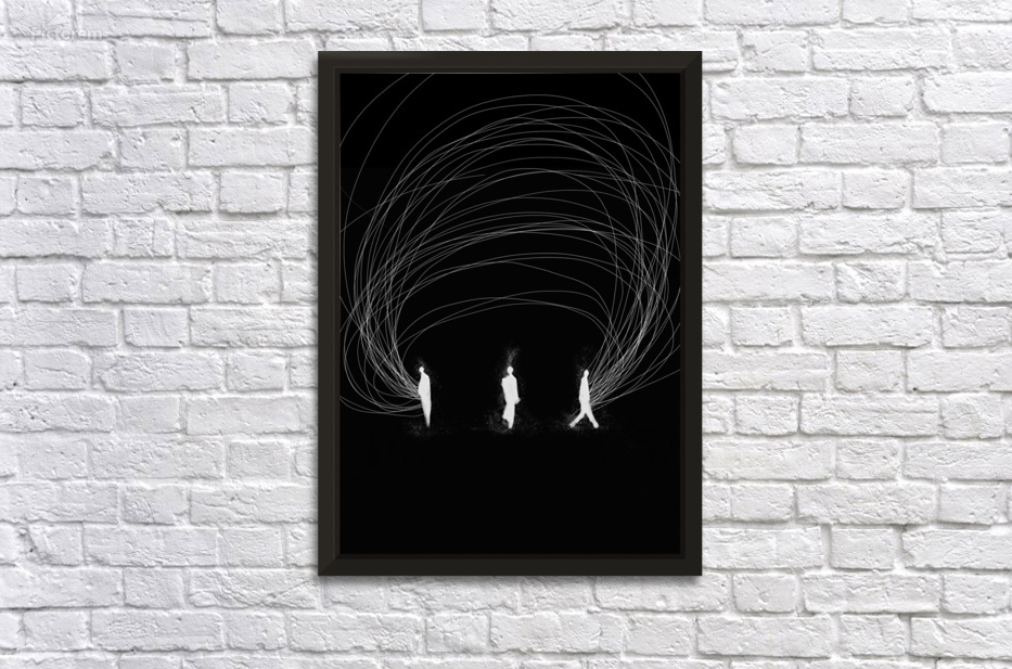 Against a deep black background three figures stand apart embodying the space between them. Each figure is isolated yet subtle lines extend between them forming delicate connections that suggest an invisible bond. The contrast of light and dark along with the sharpness of the lines emphasizes both the emotional and physical distance creating a powerful tension between solitude and unity. The black backdrop enhances the figures’ stark presence drawing the viewer into a reflection on the complexities of human relationships and the threads that tie us together even in moments of separation.