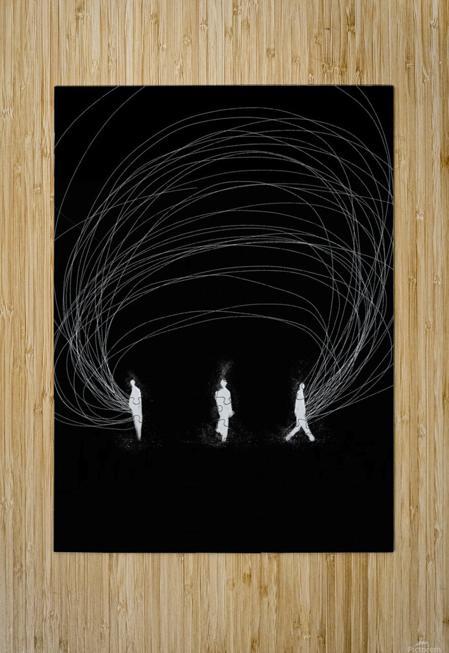 Against a deep black background three figures stand apart embodying the space between them. Each figure is isolated yet subtle lines extend between them forming delicate connections that suggest an invisible bond. The contrast of light and dark along with the sharpness of the lines emphasizes both the emotional and physical distance creating a powerful tension between solitude and unity. The black backdrop enhances the figures’ stark presence drawing the viewer into a reflection on the complexities of human relationships and the threads that tie us together even in moments of separation.