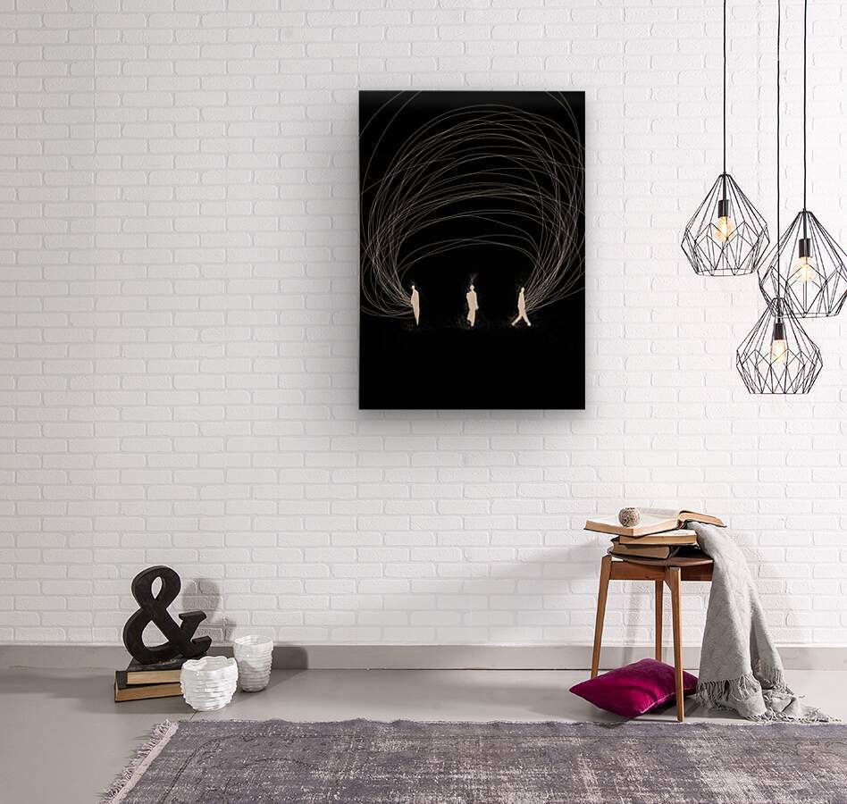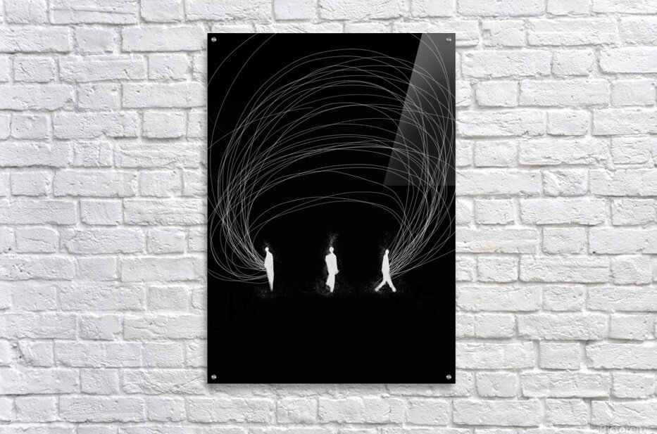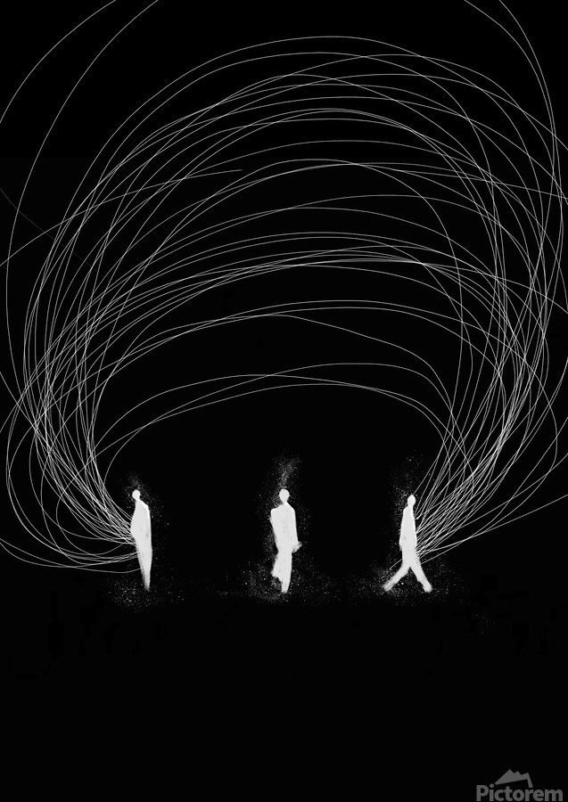 Against a deep black background three figures stand apart embodying the space between them. Each figure is isolated yet subtle lines extend between them forming delicate connections that suggest an invisible bond. The contrast of light and dark along with the sharpness of the lines emphasizes both the emotional and physical distance creating a powerful tension between solitude and unity. The black backdrop enhances the figures’ stark presence drawing the viewer into a reflection on the complexities of human relationships and the threads that tie us together even in moments of separation.